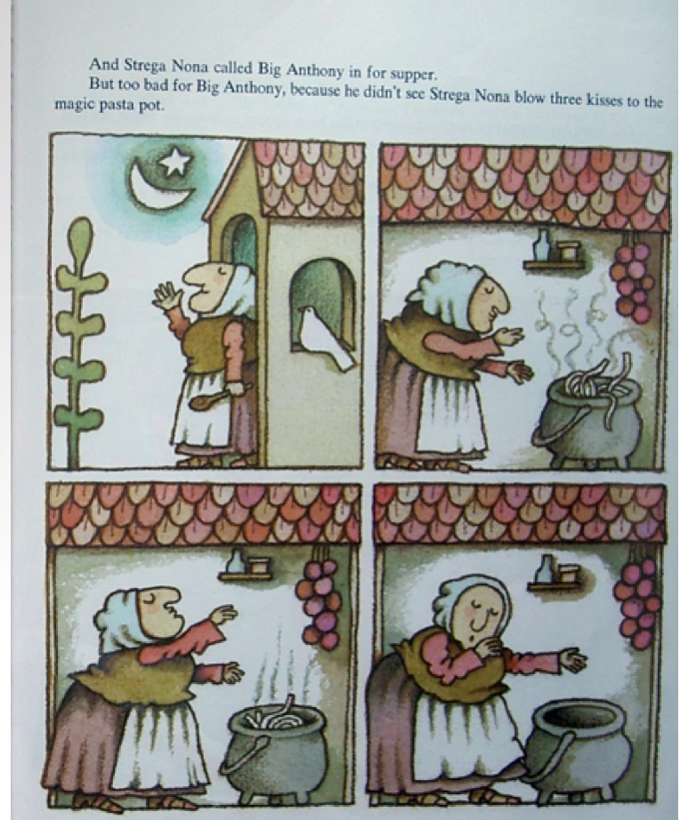 중학교 1학년 학생들과 매년 토미드 파울라가 쓴 『Strega Nona』를 읽고 있다. 이 책은 원어민 협력 수업에서 읽는 책 중의 하나이다. 쉬운 픽처북이라 생각하겠지만, 여러가지 배울 점도 있고 주제도 아이들에게 필요한 것이라 서로 의논하여 선택했다. 이탈리아 배경이다보니, 배경 그림이나 언어, 음식 등 그 나라의 분위기를 느낄 수 있다. 이탈리아 남부, Calabria의 마법사 할머니의 이야기로서, 이탈리아어로 nona는 할머니, strega는 마법사(witch)라는 뜻이다. 이탈리아는 카톨릭 국가라서 수도사, 신부, 수녀, 수도원, 수녀원 등의 어휘들이 자주 나온다.