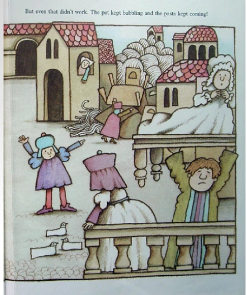할머니가 Amelia 할머니를 보러 간 사이에 자신이 요술 냄비에 파스타를 만들 수 있다는 것을 보여주기 위해 앤쏘니는 마을 사람들을 불러 모은다다. 사람들은 앤쏘니가 만든 파스타를 맛있게 먹지만, 문제가 생겼다. 앤쏘니는 요술 냄비를 멈추게 하는 주문(마지막 세번의 키스)을 모른다는 것이다. 냄비의 파스타는 그칠 기미가 보이지 않는다. 집에 가득차고, 거리에 넘쳐나고 파스타가 덮힌 세상은 사람들에게 공포를 준다.(물론 이 책은 동화같은 이야기라 재미있게 볼 수 있는 부분이긴 하다) 집안 가재도구를 이용하여 바리케이트를 쳐도 소용없다.