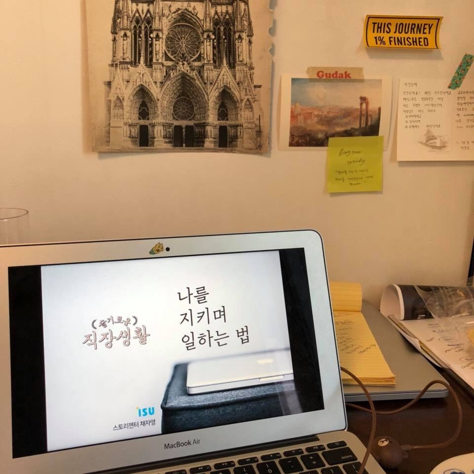 잘하고 싶은 마음이 눈빛으로 고스란히 전달될 때가 있다. 나도 안다. 2시간이라는 시간동안 앞에서 이야기하는 는 사람의 말에 한결같이 고개를 흔들어주고, 눈을 마주치는 것이 얼마나 힘들고 피곤한 일인지. 더군다가 일을 하고 늦은 저녁 시간에 듣는 강의는 더더욱 그렇다. 그러니, 최대한 그 시간이 아깝지 않게 나는 나의 이야기를 정성스럽게 풀어낼 수 밖에. 옹기종기 모여앉아 한결같은 열정으로 나를 바라봐준 임직원 분들의 열기에 정신이 순간 아득하고 아찔하였다. 참으로 감사한 마음이 드는 강의였다.