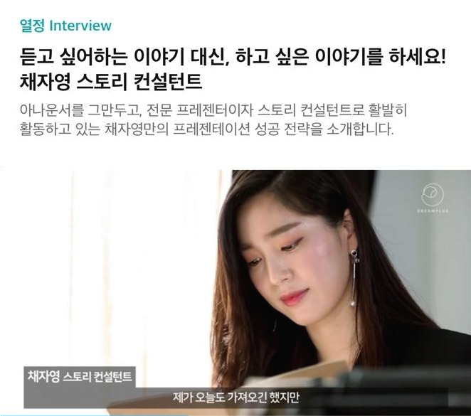 '스토리 컨설턴트'라는 이름으로 처음 나를 소개한 인터뷰였다. 매주 치열하게 경쟁 프레젠테이션의 현장에 서지만 '전문 프리젠터'라는 지난 6년간 해왔던 직업이 지금 내가 하고 있는 모든 일을 말해주지 못한다. 프리젠터라는 그릇에 내가 하는 일을 다 담아내지 못한다는 생각이, 어느 순간부터 들기 시작했다. 신기했다. 과거엔 주변에서 먼저 '프리젠터라는 직업 자신을 가두지 마세요'라는 이야기를 많이 들었는데, 때가 되니 내 스스로 그 틀을 벗어나고 있다. 프레젠테이션의 기획과 플로우를 잡는 일, 한 기업이 하고 싶은 이야기를 발견하여 브랜드 스토리로 만들어내는 일, 혹은 말하기의 본질까지 나는 이 모든 것을 '스토리'라는 한 단어로 묶어내려 한다. 새롭게 판을 짜보 싶다는 말이다. 과연 될지 모르겠지만 그렇게 하고 있(다고 믿)고 해나갈 것이다. 드림 플러스 인터뷰는 그런 나의 방향을 말할 수 있었던 감사한 기회였다.