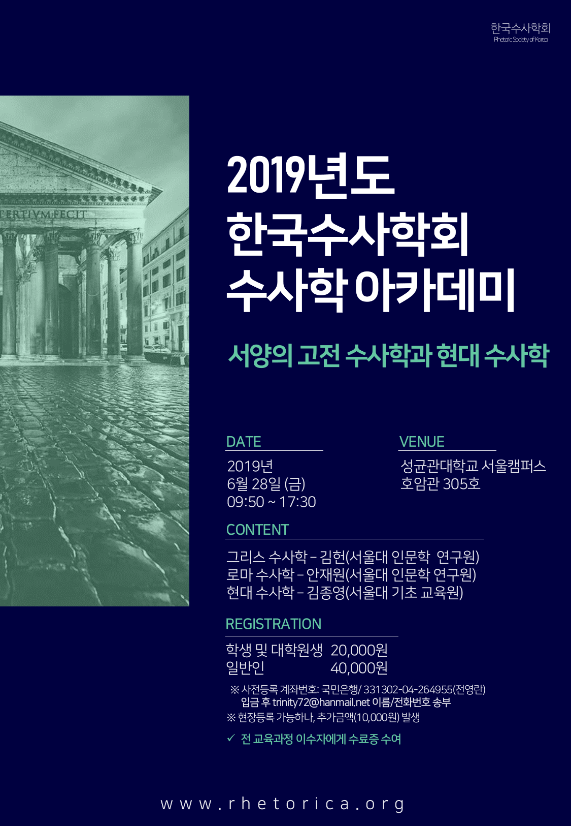 올해는 6월 29일 성균관대학교 인문사회캠퍼스에서 대학생과 일반인을 대상으로 ‘2019년 수사학 아카데미’를 개설합니다.이번 아카데미에서는 그리스수사학, 로마 수사학, 현대 수사학을 중점적으로 개설합