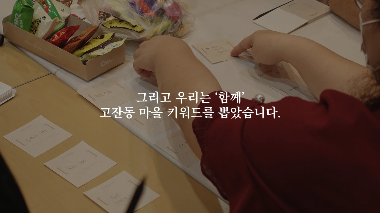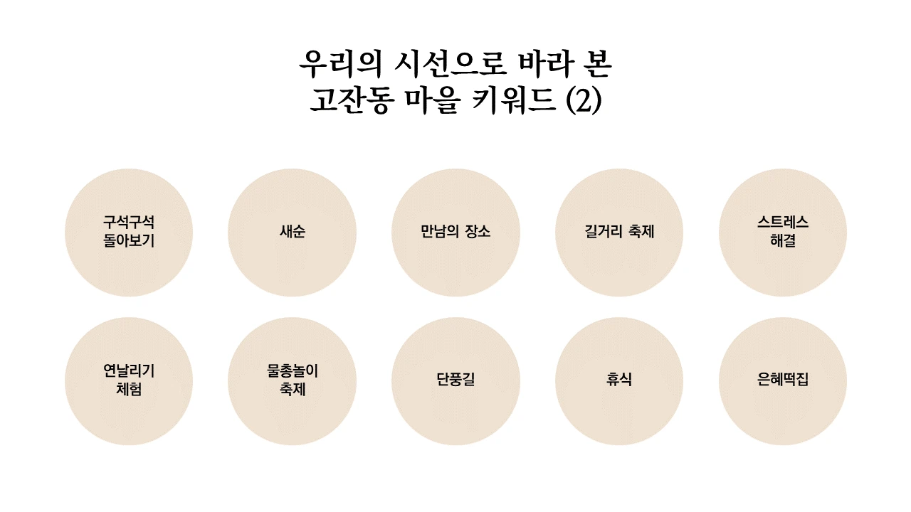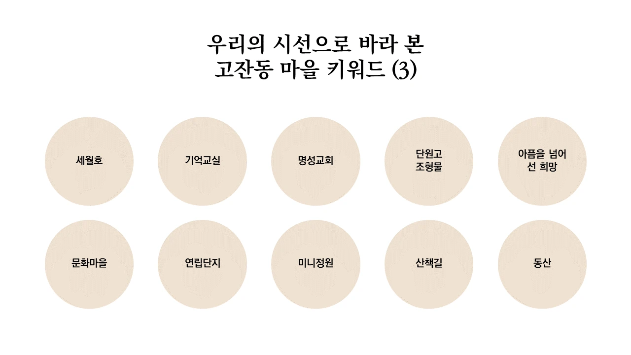 2주차에는 수집한 이야기 자산을 큐레이션하고 에디팅하는 작업을 진행한다. 우리의 시선에서 무엇을 선택할 것이고 무엇을 버릴 것인지, 주체적으로 선택하는 과정이다. 스스로 선택한다는 것에서 주체성이 부여되고, 결국 내 삶의 이야기를 타인의 시선이 아닌 내 시선으로 재편집하겠다는 의지가 반영되는 작업이기도 하다. 이는 곧 주체적으로 나의 삶을 살아가겠다는 것과 같은 것이다. 우리는 고잔동 마을 주민들을 3개로 나누고, 각각의 조가 생각하는 고잔동의 마을 키워드 10가지씩 뽑게 했다.