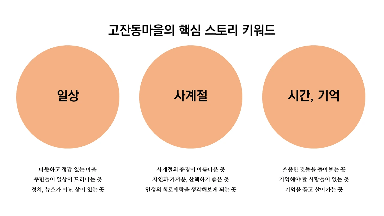 1주차에는 주민의 시선으로 바라본 ‘고잔동’의 이야기 자산을 수집했다. 우리 이야기 개발 플로우의 가장 큰 특징은 ‘사람’을 중심으로 만들어진다는 것.