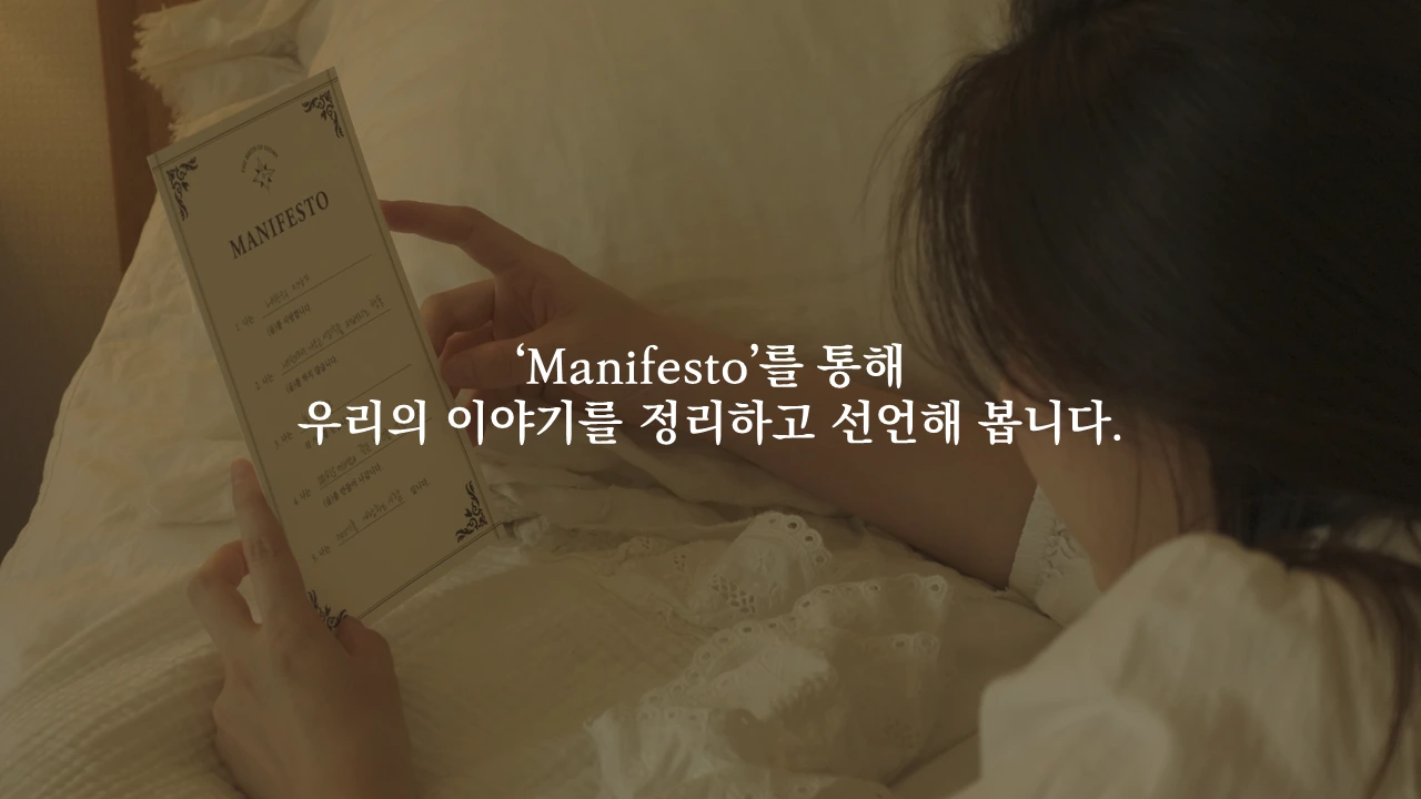 매니페스토는 말 그대로 ‘선언문’이다. 보통 선언문이라고 하면 국가에서 정치적인 의미로 사용되거나 브랜드에서 자신들의 철학을 이야기할 때 사용된다. 하지만 필로스토리에서는 이 선언문을 ‘개인의 맥락’에서 사용하는 작업을 계속 한다.