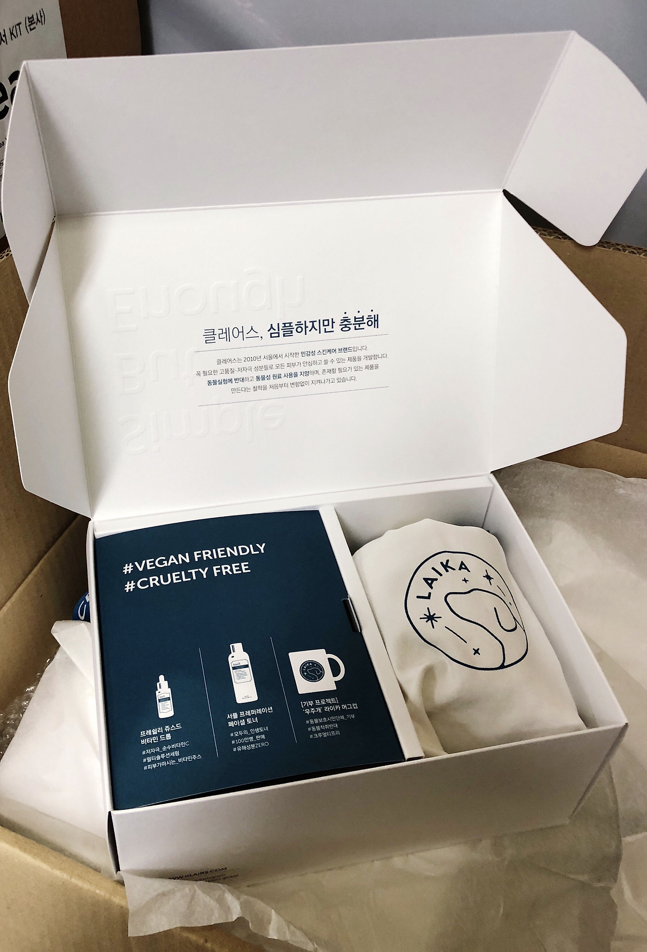 키트 구성품은 클레어스 서플 토너-비타민 드롭-라이카 머그컵-스티커팩. 클레어스는 모든 제품이 스테디셀러이자 베스트셀러지만, 그중에서도 서플 토너랑 비타민드롭은 눈에 띄는 인기 제품들이다. 비건Vegan이고. 어떤 제품을 넣을지 고민고민 끝에 결국 이 두 가지로 결정!