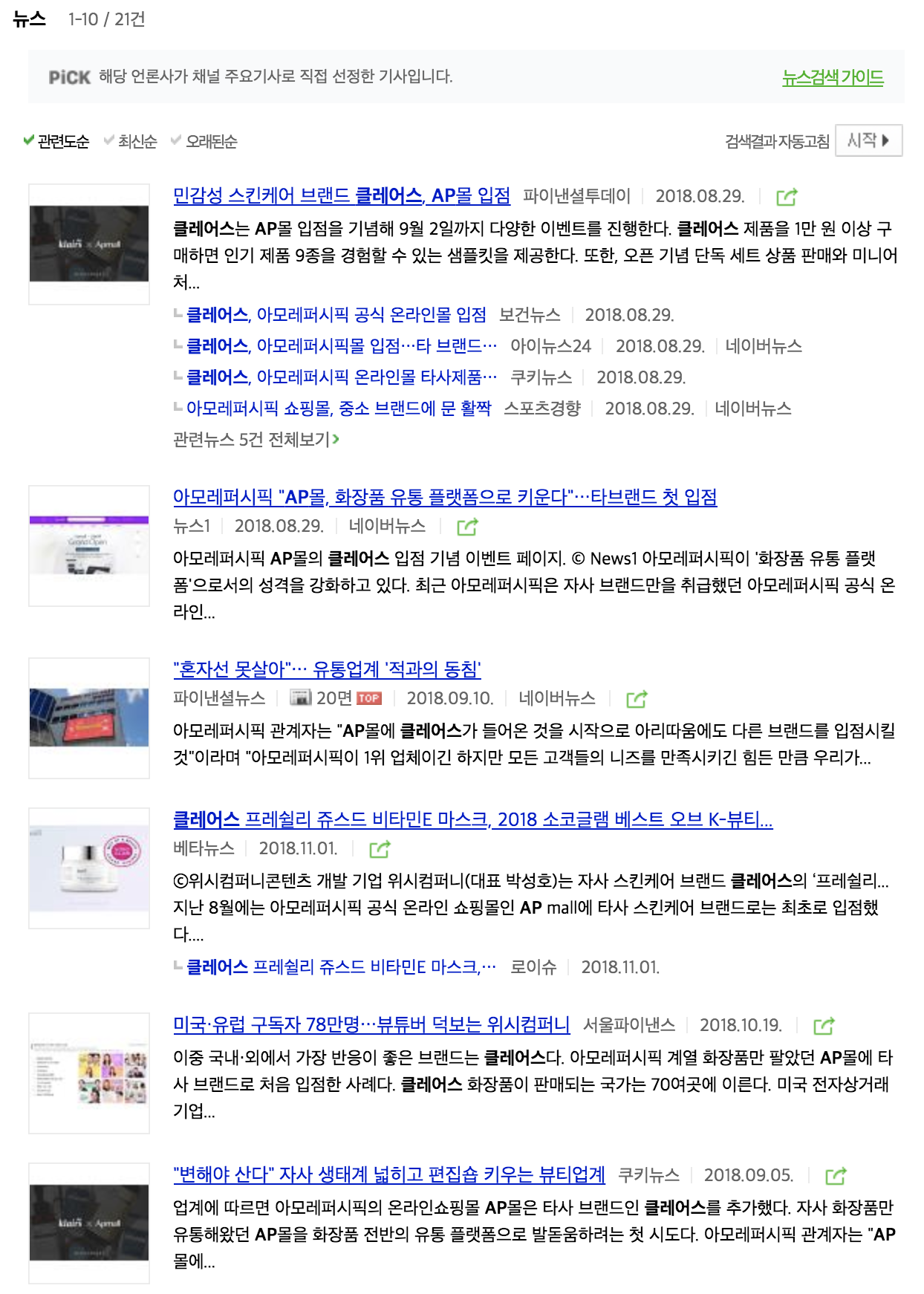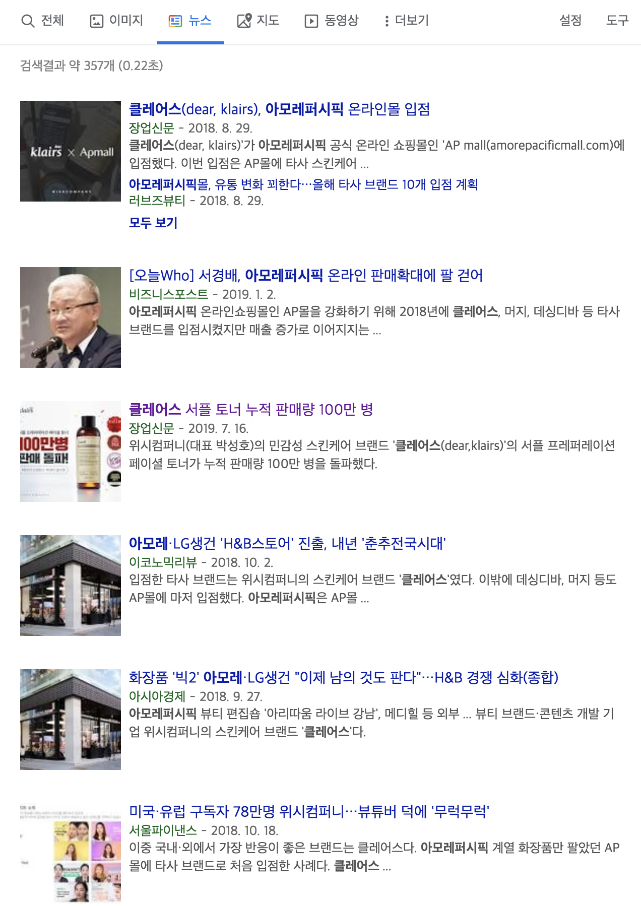 자료는 재밌게 썼는데 배포가 걱정이었다. 직전까지 IT 회사에서 일했으니 유통/산업 분야 기사 배포는 너무 오랜만이었고, 혼자 가능할까 싶었다. 고민고민 끝에 그래도 이 정도면 대부분 관심 가질 뉴스겠다~ 싶어 혼자 해보기로 했다. 시의성과 자료 가치를 놓치지 않으려 같이 입점하는 다른 카테고리 브랜드들보다 가능한 빠르게 기사화하려 했고, 그 덕인지 보도자료 외에도 이 주제로 기사가 나올 때마다 클레어스는 가장 먼저 언급됐다.