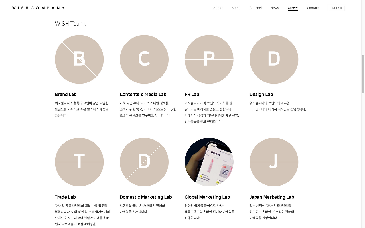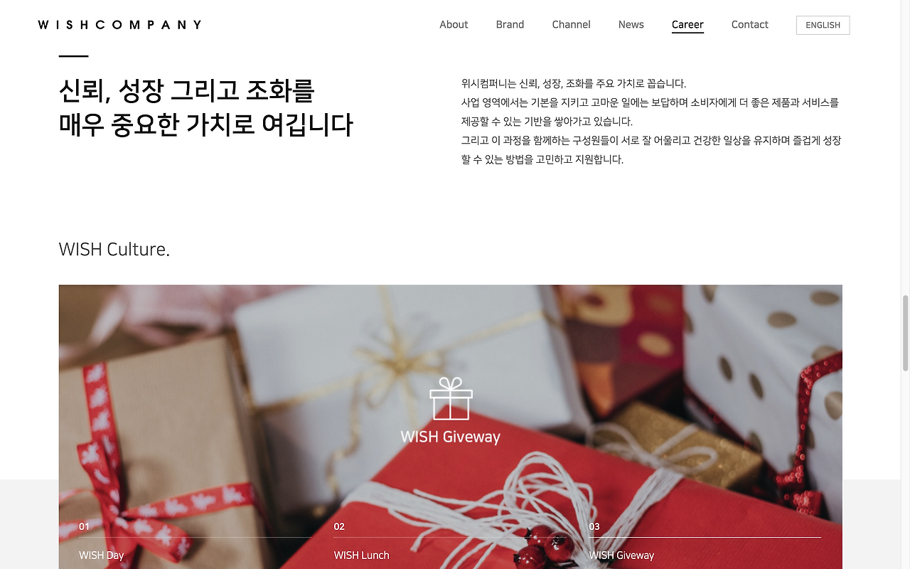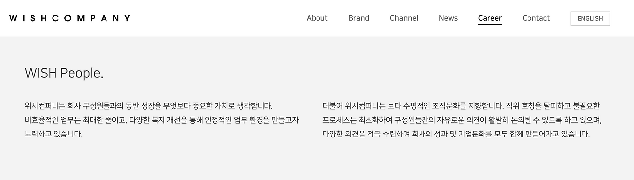 위시컴퍼니의 핵심은 각각의 철학을 가진 뷰티 브랜드와 꾸준히 쌓아온 컨텐츠다. 한마디로 뷰티 브랜드와 컨텐츠를 개발하는 회사라고 할 수 있고, 그걸 그대로 써냈다. '뷰티 브랜드·콘텐츠 개발 기업'. 이렇게 한 줄, 한 장, 한 문단의 문장들을 다듬거나 새로 썼다. 그리고 그것들을 반영해 홈페이지, 프레스킷, 보도자료, 채용공고 등 바깥에 보여지는 대부분의 것들을 새로 만들었다.