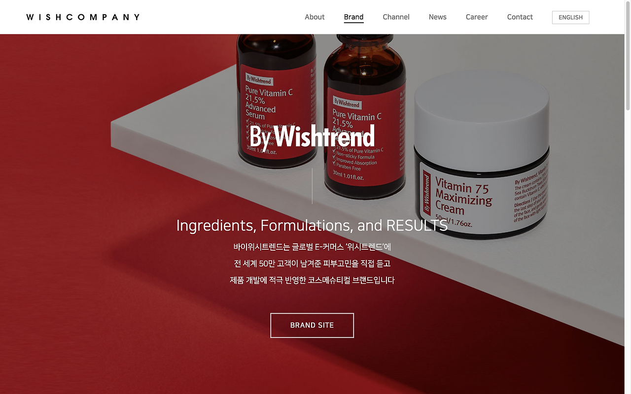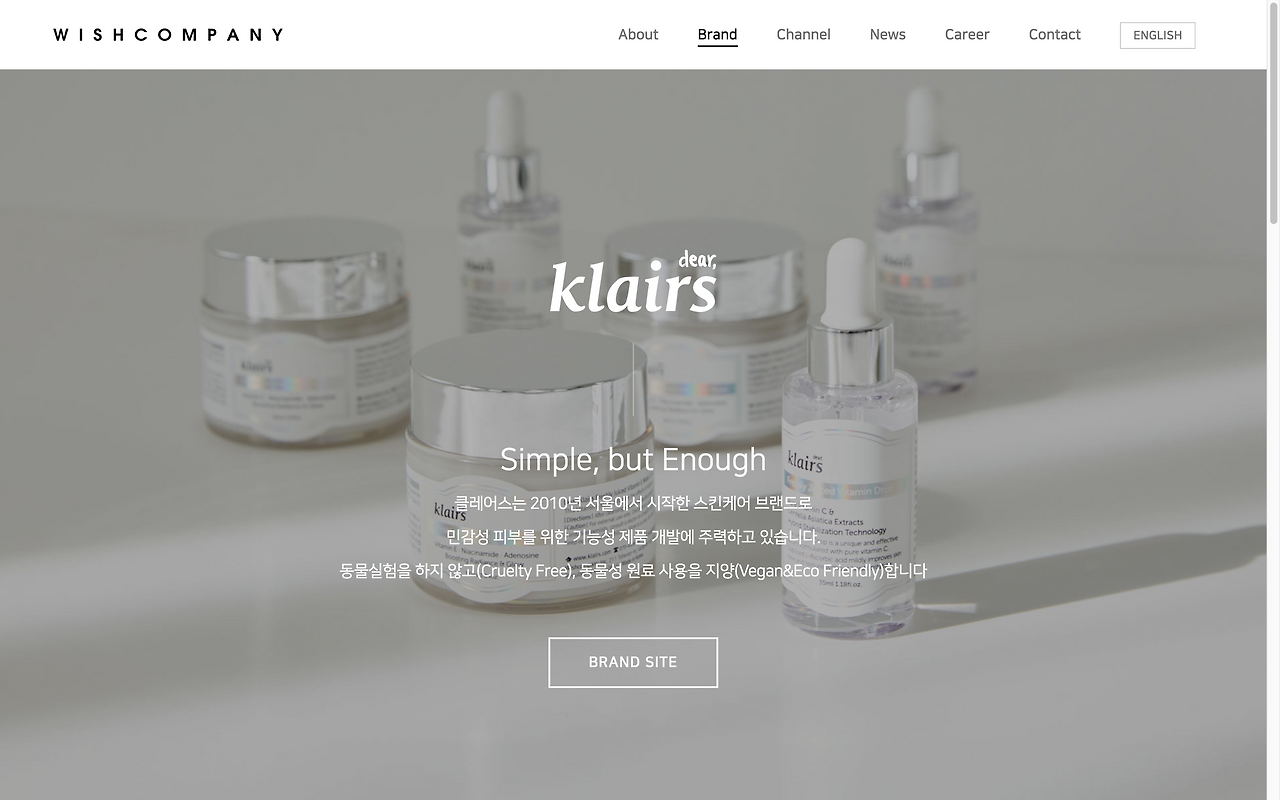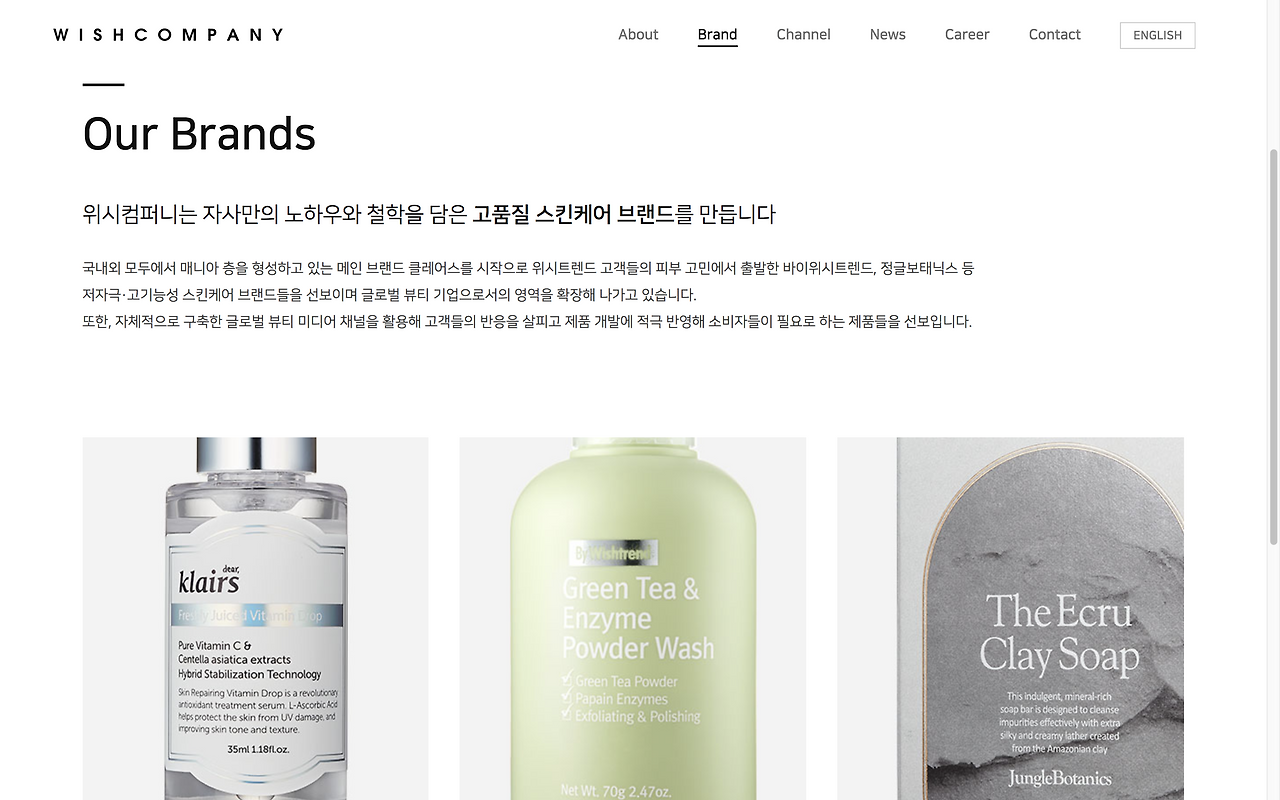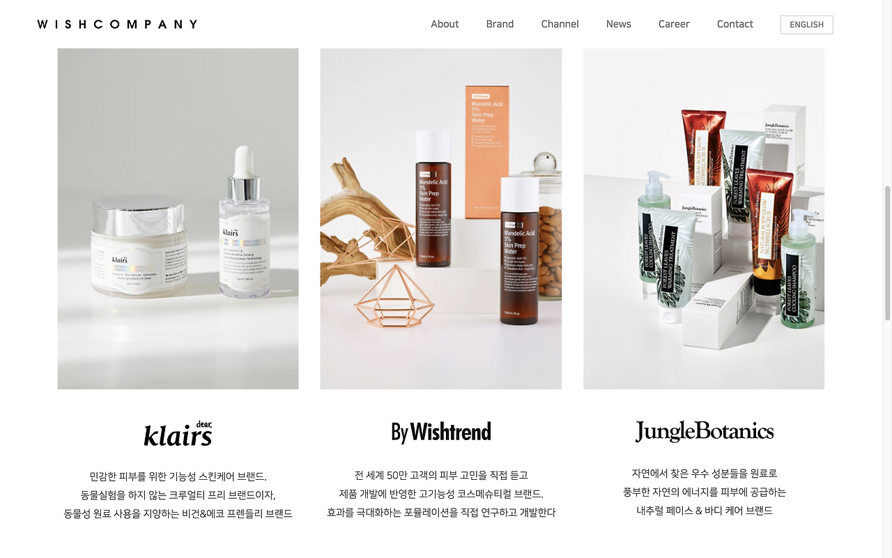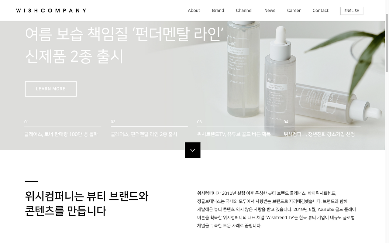 새 일터 소개를 먼저 간단히 해보자면 위시컴퍼니는 화장품 중에서도 스킨케어 제품을 만든다. 40여 개 국가에 판매하고, 스킨케어에 관한 컨텐츠를 만들어 유튜브와 소셜미디어에 이야기한다. 메인 브랜드는 클레어스 Klairs, 바이위시트렌드 ByWishtrend. 그리고 직접 운영하는 제품 판매채널 위시트렌드와 이야기 채널인 wishtrendTV가 있다. 클레어스는 토너만 봐도 100만 병 이상을 팔았고, 위시트렌드TV는 100만 구독자를 넘겼다. 그래서 보도자료를 쓰고 홈페이지를 만들기 시작하면서 위시컴퍼니를 '뷰티 브랜드·콘텐츠 개발 기업'이라고 정의했다.