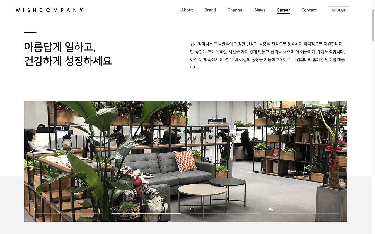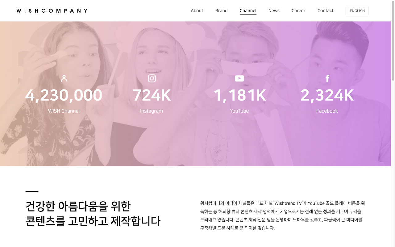 홈페이지를 리뉴얼하면서는 위시컴퍼니가 컨텐츠를 다룬다는 점을 더 잘 보여주고 싶어 영상을 기획해 넣었다. 자세한 콘티 제작과 촬영/편집은 위시트렌드TV를 운영하고 컨텐츠를 만드는 CM(Contents Media)랩에서 잘 뽑아주셨다. 바로 아래 영상이 그 결과물!