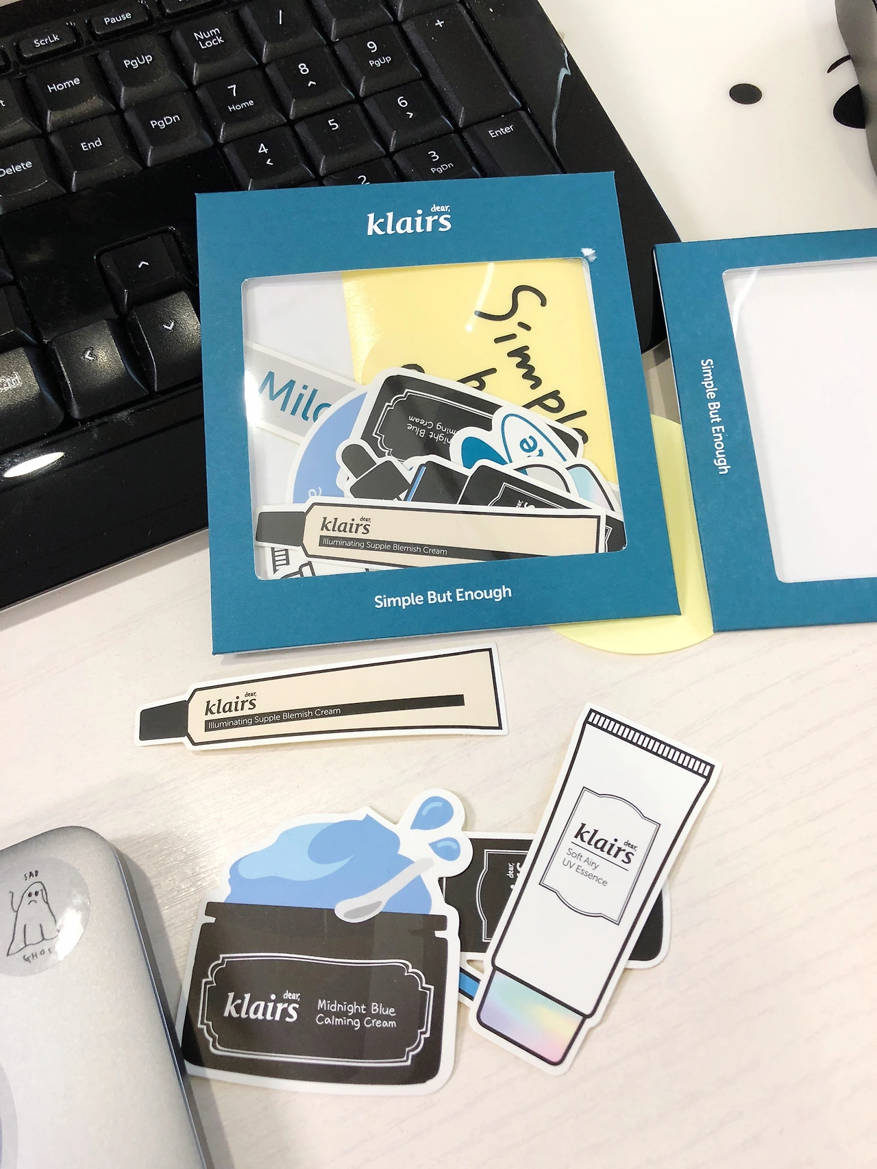 라이카 머그컵은 클레어스의 두 번째 기부 프로젝트 '우주개 라이카'의 판매상품이었다. 동물실험을 하지 않는 크루얼티 프리Cruelty Free 브랜드라는 이야기를 하고 싶어 추가로 제작했고 컵이 정말 예쁘다 흑흑. 그리고 마지막으로 스티커팩은! 클레어스 슬로건과 제품들이 일상 여기저기에서 예쁘게 보이면 좋지 않을까(사심) 하며 만들었고 진짜 예쁘니까 받으시는 모든 분들이 좋아하시리라 굳게 믿고 있다ㅎ..