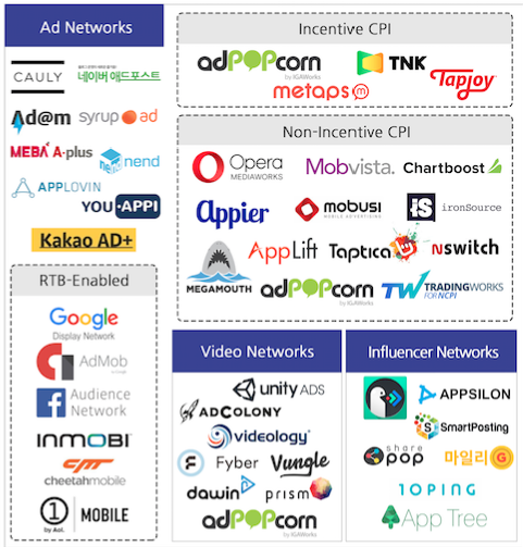 모바일광고 집행을 편리하게 하기 위해 광고 매체를 묶어 네트워크화 한 것을 ‘애드 네트워크’라 한다. GDN(Google Display Network), 페이스북 오디언스 네트워크, 애드팝콘, 애드몹, 인모비, 카울리 등이 있다. RTB-Enabled는 RTB(Real Time Bidding, 실시간 경매) 광고가 가능하다는 뜻이다. 그리고 Incentive CPI는 보상형 CPI 광고를, Non-Incentive CPI는 비보상형 CPI 광고를 주로 한다.