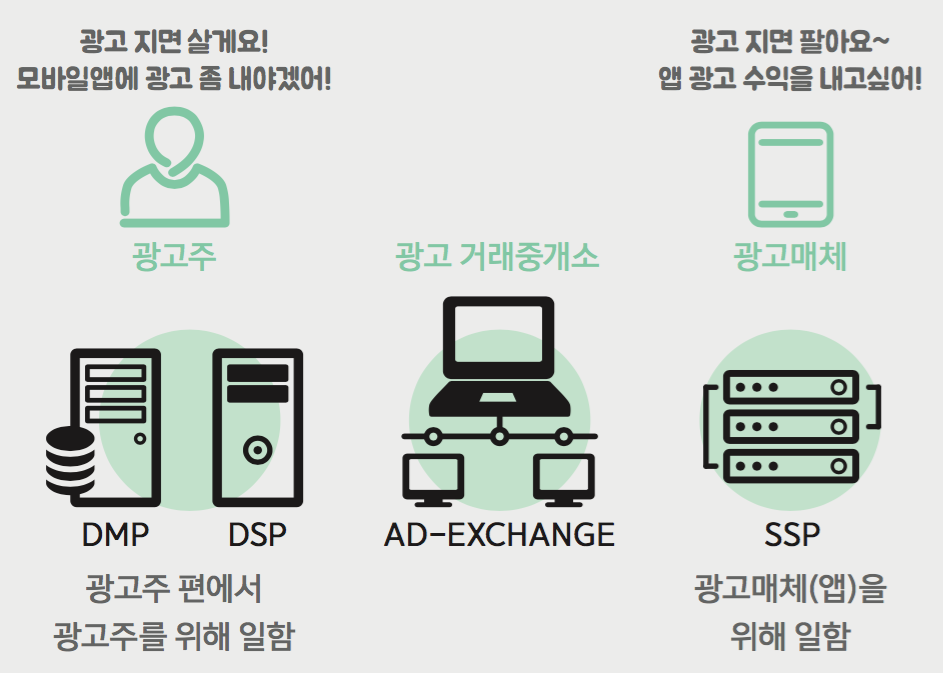 DMP, DSP, 애드익스체인지, 애드 네트워크, SSP… 여기까지만 봐도 뭔가 되게 복잡하게 느껴지겠지만, 그냥 ‘광고주와 광고 매체가 모바일 광고를 거래하기 위해서는 이만큼 복잡한 영역이 존재한다’ 정도로 생각하면 된다. 이 많은 영역은 각각 어떤 일을 하고 있을까. 모바일 광고가 이런 흐름으로 진행된다는 것을 알았으니, 각 영역이 정확히 어떤 일을 하고, 영역마다 어떤 기업들이 있는지 살펴보자.
