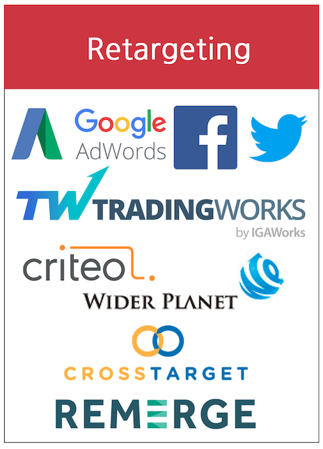 앞서 원고에서도 많이 언급했듯, 리타깃팅은 이름 그대로 다시 타깃팅 하는 방식이다. 이미 앱을 이용했던 사용자들을 대상으로 진행한다. 앱을 이용하다가 이탈했거나, 이용 중이지만 앞으로 이탈할 것으로 보이는 사용자들을 다시 불러들이기 위해 보상을 지급하거나 차별화된 메시지를 전달해 재방문을 유도한다. 리타깃팅 광고를 진행하는 플랫폼은 구글 애드워즈, 페이스북, 트위터, 트레이딩웍스, 크리테오 등이 있다.