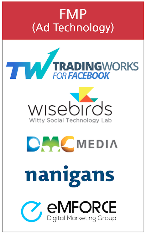 페이스북 광고 캠페인 운영을 위한 기술력과 운영 능력을 모두 갖춘, 페이스북 공식 마케팅 파트너 기업들이다. 여기에는 애드테크 부문의 파트너들을 모았다. 이들은 페이스북 광고의 가치를 높일 수 있는 혁신적인 기술과 그를 활용한 실제 광고 운영 능력, 캠페인 집행 결과 등을 기준으로 더 쉽고 효과적인 페이스북 마케팅 전개를 돕는다. TRADINGWORKS FOR FACEBOOK(TF2), 와이즈버즈 등이 있다.