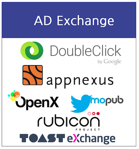 애드 익스체인지는 애드 네트워크 규모가 점점 커지면서 생긴 애드 네트워크 묶음이다. 한마디로 광고 거래 중개소다. 수많은 애드 네트워크와 연결되고 네트워크 간 거래가 가능하다. 복수의 미디어나 애드 네트워크에서 입찰 방식을 통해 광고 재고를 구입할 수 있는 시스템으로, 애드 네트워크 또는 DSP를 경유해 구입한다. 구글 더블클릭, 앱넥서스, 모펍 등이 있다.