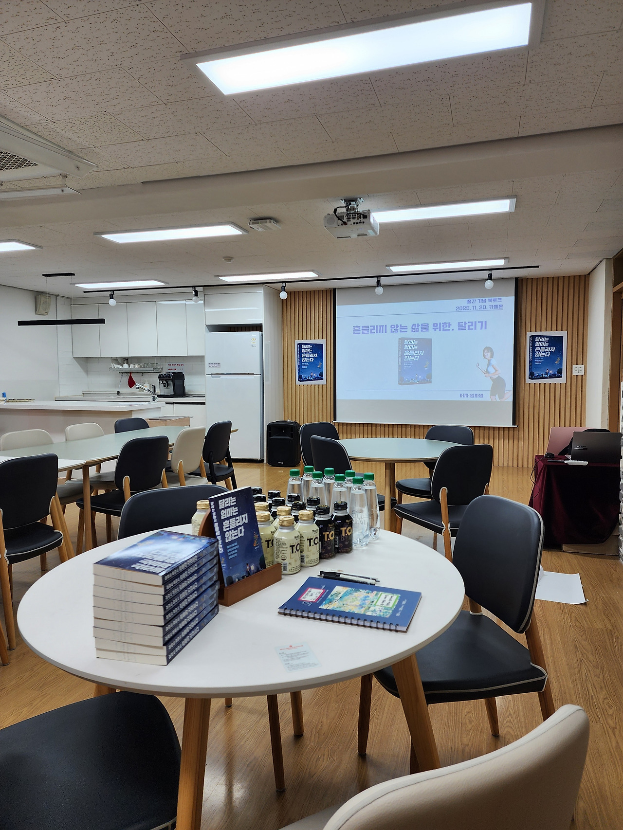 교장선생님은 올해 다리가 아프셨는데, 내 책을 읽고 달리기를 꾸준히 해오셨는데 이 날 하필 출근을 못하셨다. 학교에서 서로의 꿈을 응원하고 지내던 한 선생님은 조퇴를 하게 되어, 미안한 마음에 선물만 보내주셨다. 북토크를 어떻게 그렇게 준비하냐고 기특해하던 한 선생님은 출장으로, 달리기에 관심을 갖고 물어보시던 한 분은 연가로 못 나오셨고, 내 책의 가장 첫 독자가 되어주신 보안관님은 근무를 서야 해서 못 오셨다. 그런데도 불구하고 와주신 분이 11분이 되었다.