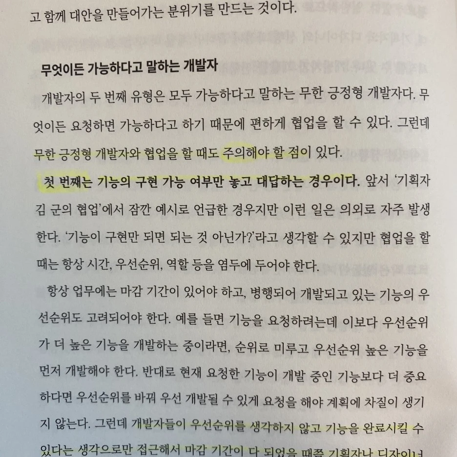 따라서 모두 가능하다고 말하는 개발자와 협업할 때는 항상 조건들을 확실하게 붙여서 요청을 해야 한다. 이 유형의 개발자는 있는 그대로 보면서 개발하기 때문에 이상하다고 느껴지거나 부족한 부분을 따로 이야기해 주지 않는다.