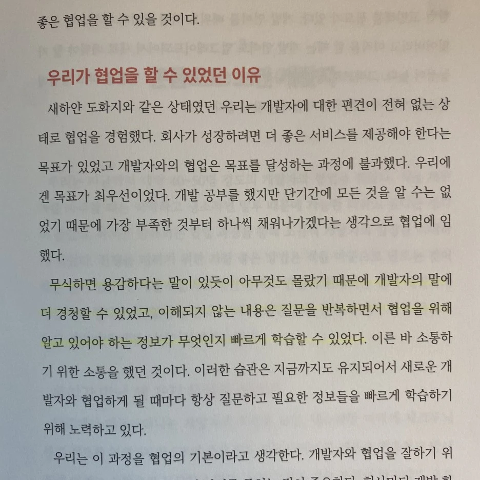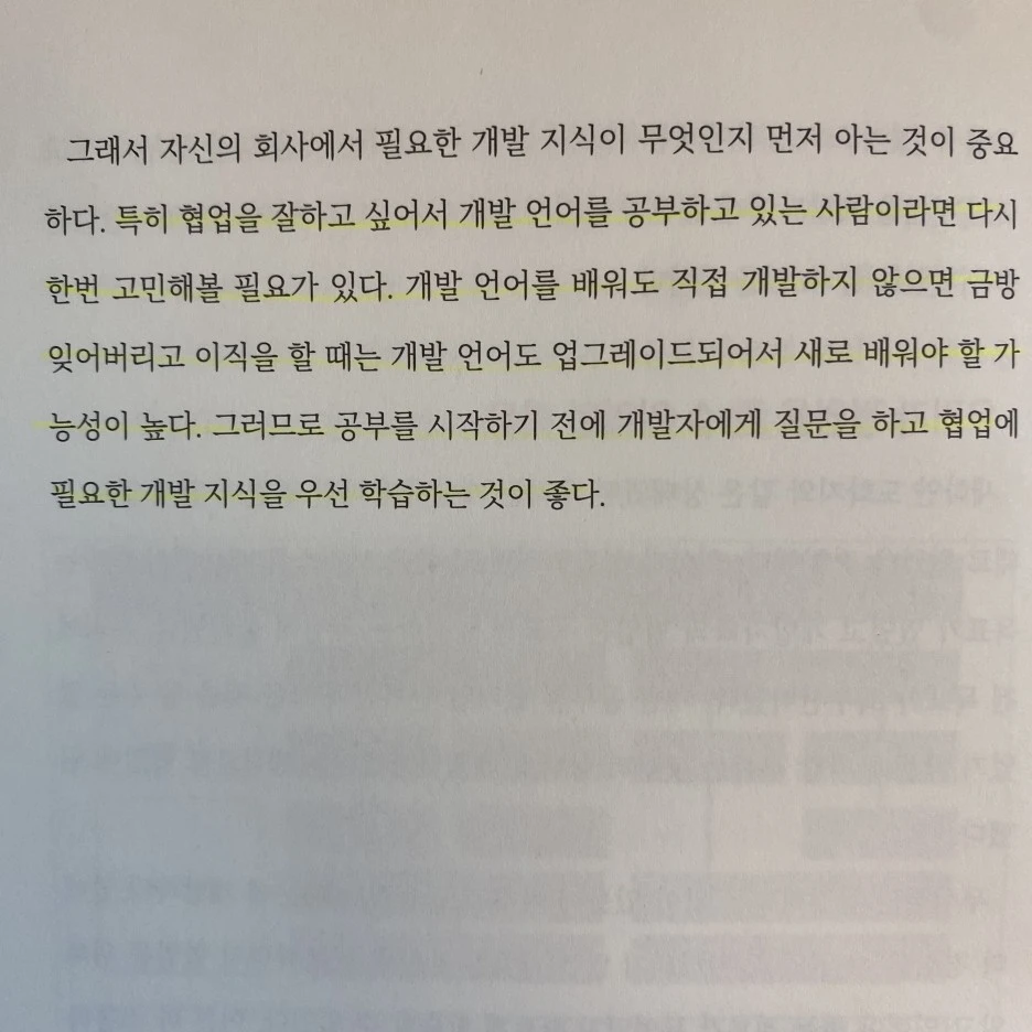 특히 협업을 잘하고 싶어서 개발 언어를 공부하고 있는 사람이라면 다시 한번 고민해 볼 필요가 있다. 개발 언어를 배워도 직접 개발하지 않으면 금방 잊어버리고 이직을 할 때는 개발 언어도 업그레이드되어서 새로 배워야 할 가능성이 높다. 그러므로 공부를 시작하기 전에 개발자에게 질문을 하고 협업에 필요한 개발 지식을 우선 학습하는 것이 좋다.
