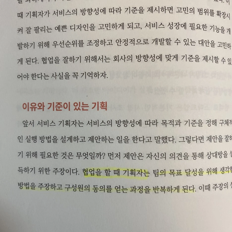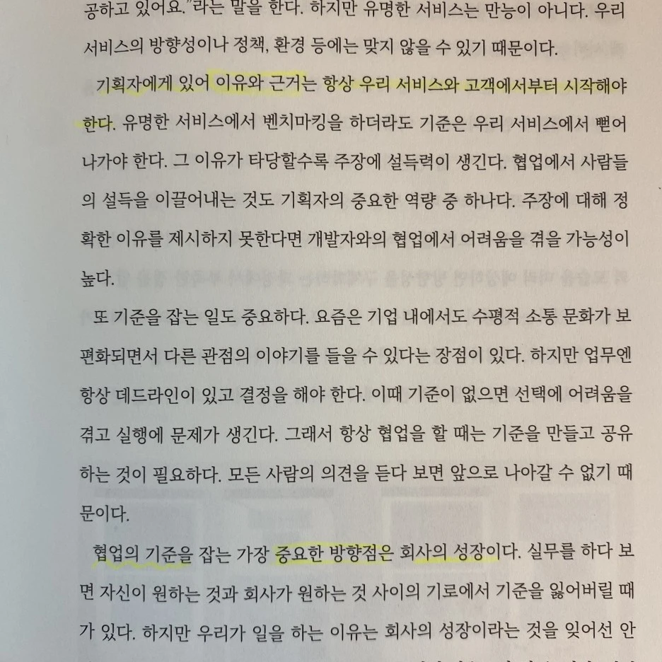 협업을 할 때 기획자는 팀의 목표 달성을 위해 생각한 방법을 주장하고 구성원의 동의를 얻는 과정을 반복하게 된다. 기획자에게 있어 이유와 근거는 항상 우리 서비스와 고객에서부터 시작해야 한다. 협업의 기준을 잡는 가장 중요한 방향점은 회사의 성장이다.