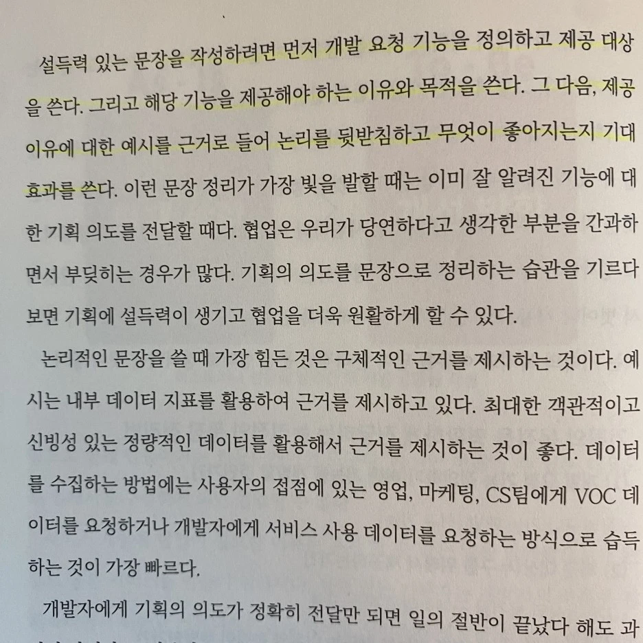 책 제목에서부터 나의 궁금증 채워줄 것이란 확신을 강하게 주었던 '오늘도 개발자가 안 된다고 말했다'가 나의 커다란 물음표를 줄여주는 데 도움을 주었다. '안 된다'라고 하는 부정적인 답변 속에 회사와 직원들의 여러 가지 의미가 내포될 수 있고, '된다'라고 하는 긍정적인 답변도 생각보다 긍정적이기만 하지 않다는 것을 이 책을 통해 알 수 있었다. 더불어 중요한 것은 기획자라면 응당 알아야 하는 IT 지식과 협업이 필요한 정보들을 습득할 수 있다는 것이 가장 좋은 부분이었다. 한 마디로 표현하면 PM으로써 해야 할 일들을 머릿속에서 그려볼 수 있게 해주는 책이었다.
