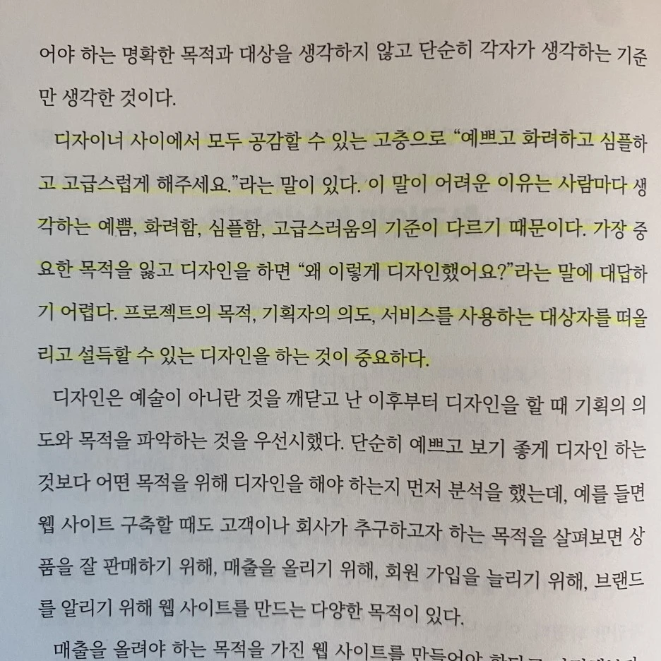 디자이너 사이에서 모두 공감할 수 있는 고충으로 "예쁘고 화려하고 심플하고 고급스럽게 해주세요."라는 말이 있다. 이 말이 어려운 이유는 사람마다 생각하는 예쁨, 화려함, 심플함, 고급스러움의 기준이 다르기 때문이다. 가장 중요한 목적을 잃고 디자인을 하면 "왜 이렇게 디자인했어요?"라는 말에 대답하기 어렵다. 프로젝트의 목적, 기획자의 의도, 서비스를 사용하는 대상자를 떠올리고 설득할 수 있는 디자인을 하는 것이 중요하다.