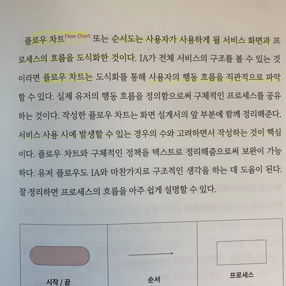플로우 차트 또는 순서도는 사용자가 사용하게 될 서비스 화면과 프로세스의 흐름을 도식화한 것이다. IA가 전체 서비스의 구조를 볼 수 있는 것이라면 플로우 차트는 도식화를 통해 사용자의 행동 흐름을 직관적으로 파악할 수 있다. 서비스 사용 시에 발생할 수 있는 경우의 수를 고려하면서 작성하는 것이 핵심이다.