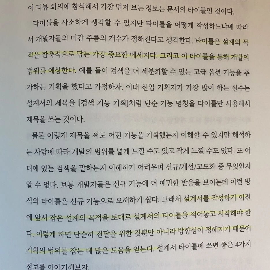 타이틀은 설계의 목적을 함축적으로 담는 가장 중요한 메시지다. 그리고 이 타이틀을 통해 개발의 범위를 예상한다. 설계서를 작성하기 이전에 앞서 잡은 설계의 목적을 토대로 설계서의 타이틀을 적어놓고 시작해야 한다. 이렇게 하면 단순히 전달을 위한 것뿐만 아니라 방향성이 정해지기 때문에 기획의 범위를 잡는 데 많은 도움을 얻는다.