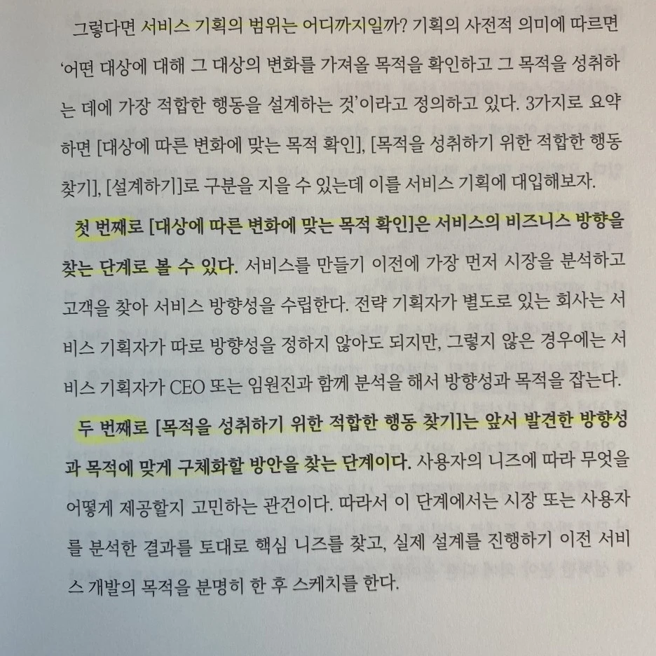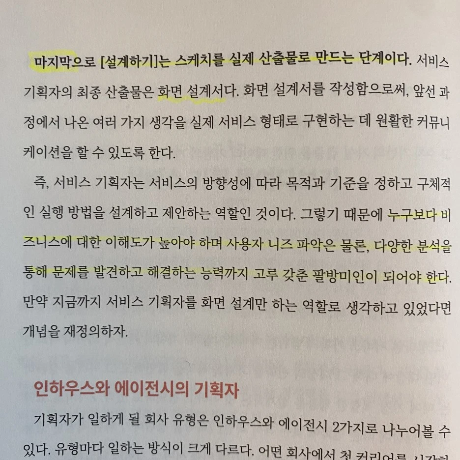 서비스 기획자는 서비스의 방향성에 따라 목적과 기준을 정하고 구체적인 실행 방법을 설계하고 제안하는 역할인 것이다. 그렇기 때문에 누구보다 비즈니스에 대한 이해도가 높아야 하며 사용자 니즈 파악은 물론, 다양한 분석을 통해 문제를 발견하고 해결하는 능력까지 고루 갖춘 팔방미인이 되어야 한다.