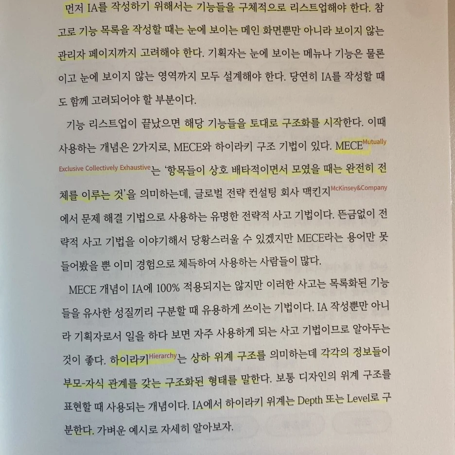 기능 리스트업이 끝났으면 해당 기능들을 토대로 구조화를 시작한다. MECE(Mutually Exclusive Collectively Exhaustive)는 '항목들이 상호 배타적이면서 모였을 때는 완전히 전체를 이루는 것'을 의미하는데, 맥킨지에서 문제 해결 기법으로 사용하는 유명한 전략적 사고 기법이다.