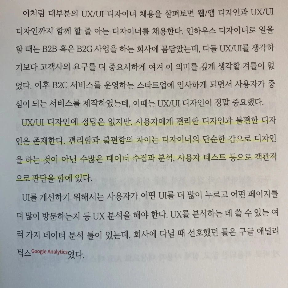UX/UI 디자인에 정답은 없지만, 사용자에게 편리한 디자인과 불편한 디자인은 존재한다. 편리함과 불편함의 차이는 디자이너의 단순한 감으로 디자인을 하는 것이 아닌 수많은 데이터 수집과 분석, 사용자 테스트 등으로 객관적으로 판단을 함에 있다.