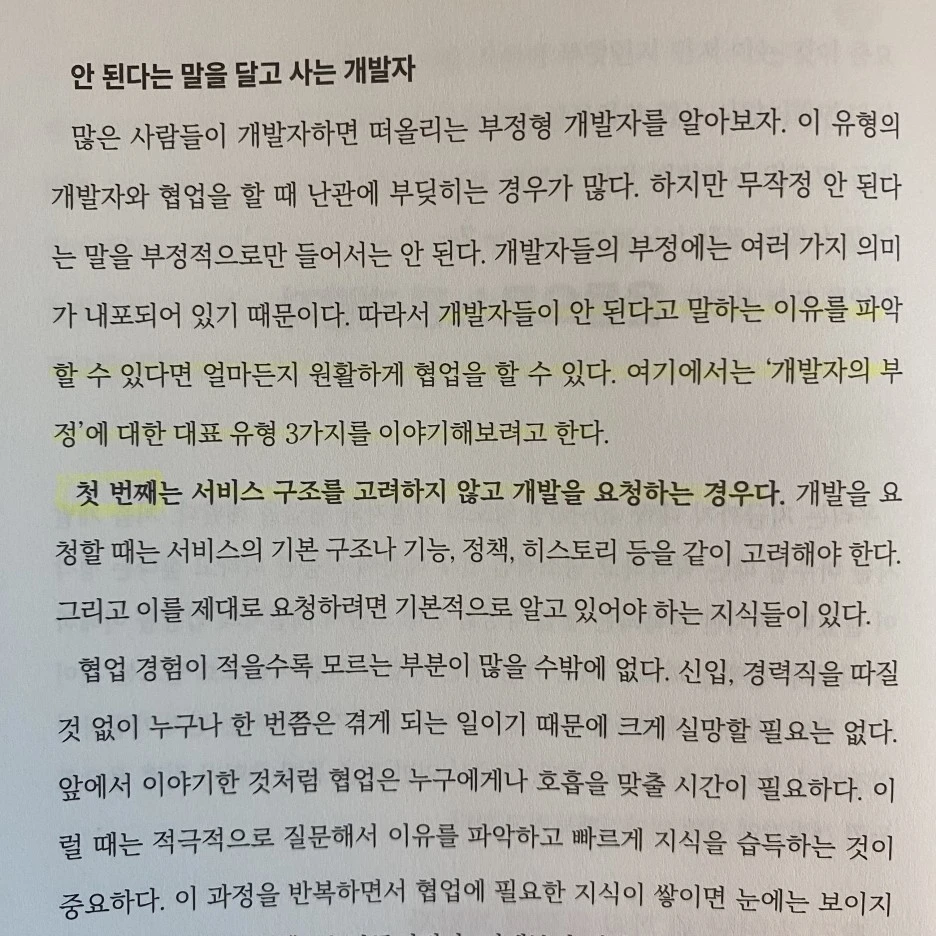 개발자들이 안 된다고 말하는 이유를 파악할 수 있다면 얼마든지 원활하게 협업을 할 수 있다. 여기에서는 '개발자의 부정'에 대한 대표 유형 3가지를 이야기해 보려고 한다.