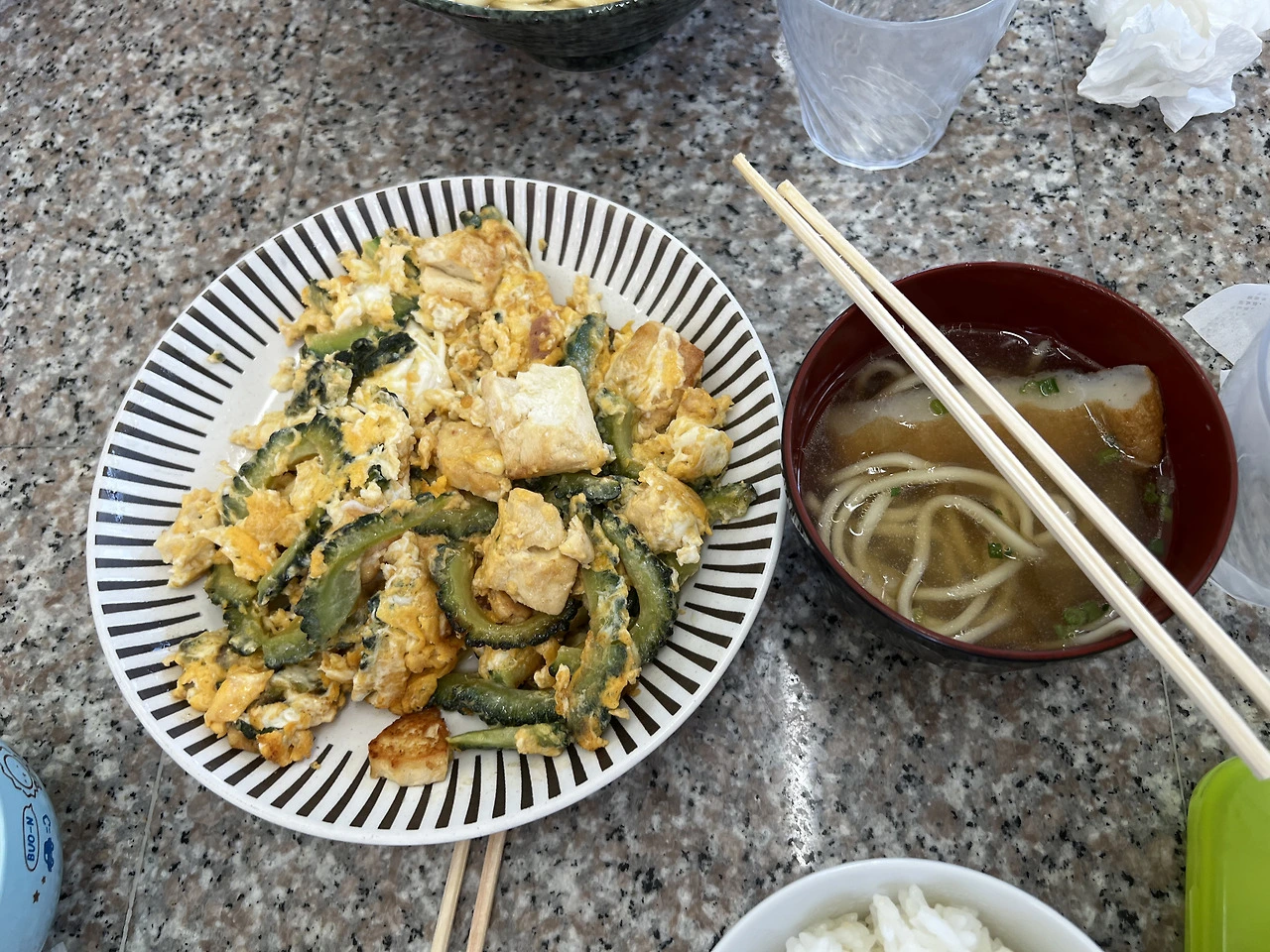 항상 참새먹이만 한 양에 익숙해져 있던 우리는 가격이 저렴해 양이 많을 거라고는 생각하지 않았는데, 오키나와 소바는 일반적인 양의 1.5배 정도나 되었고, 고야 챔플 역시 푸짐했다.