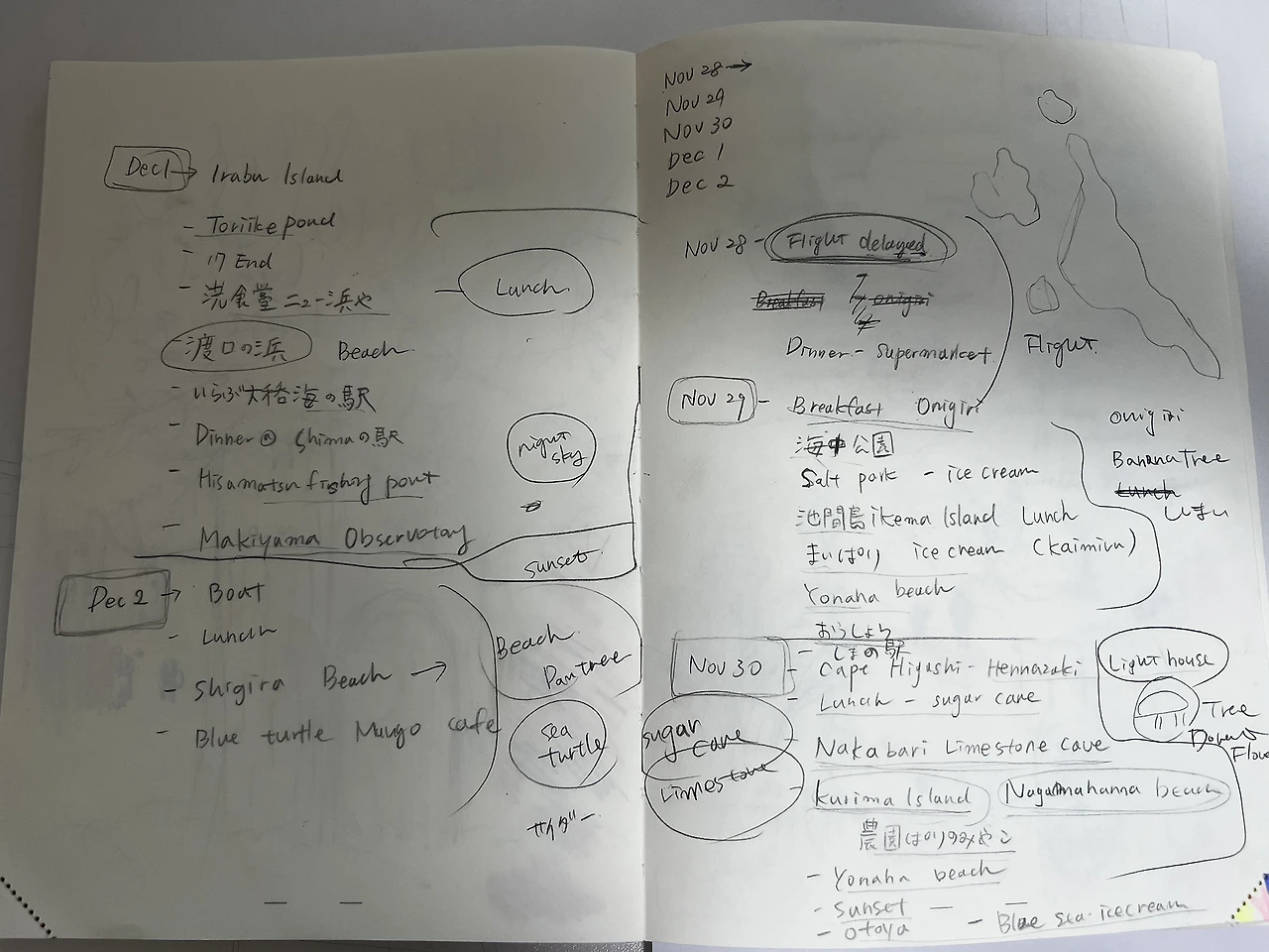 그래서일까. 일러스트 지도를 만들자는 생각을 하기 훨씬 전부터 이번 여행은 뭔가 그림을 그려서 남겨놓고 싶다는 생각을 했고 일단은 언제나처럼 구글맵에 저장해 둔 여행지를 보면서 며칟날 어디를 다녀왔는지 대충 노트에 끄적거려 놓았었다.