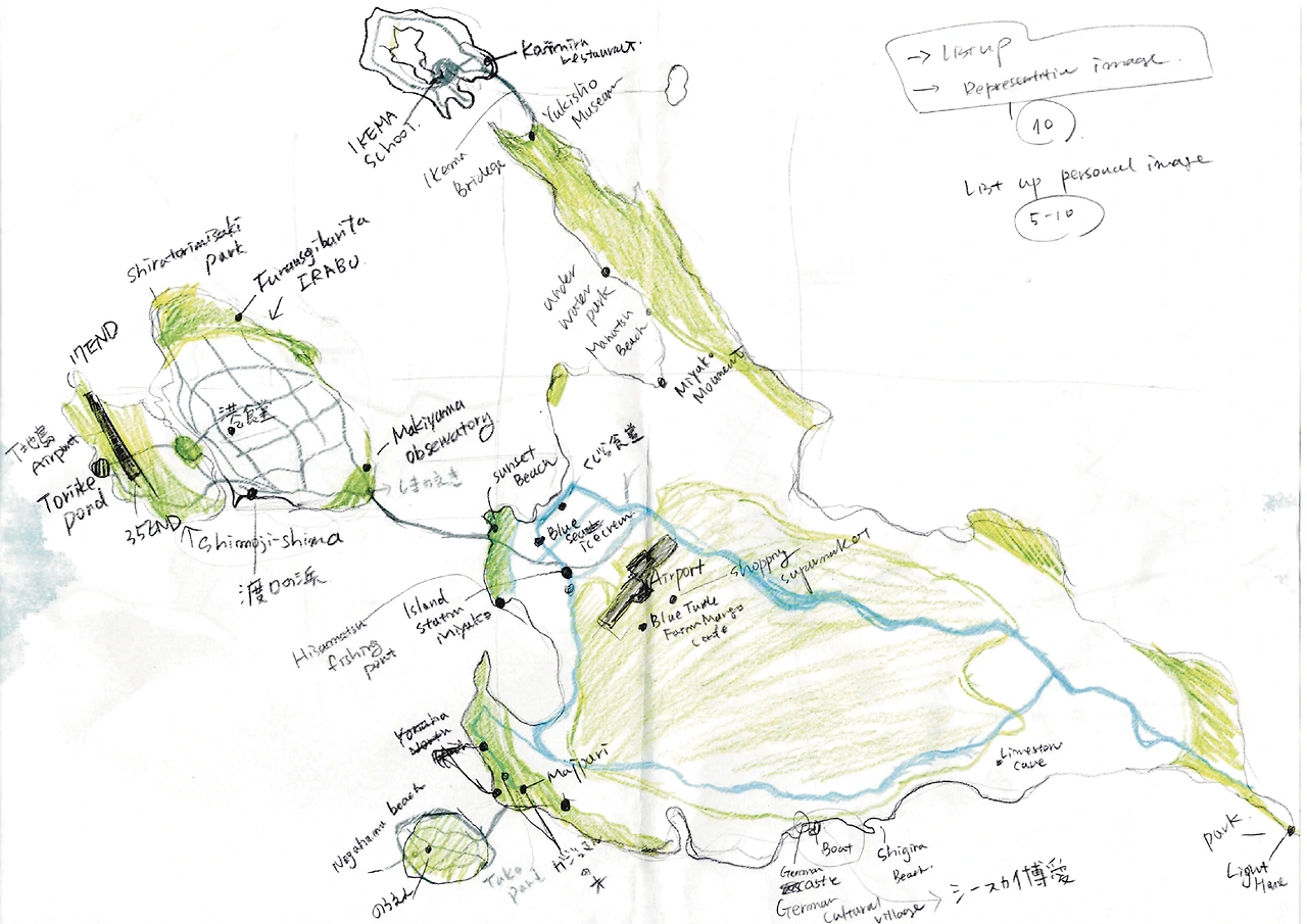 구글맵을 참고해 미야코지마의 형태를 A3 용지에 먼저 연필로 그려 보았다.