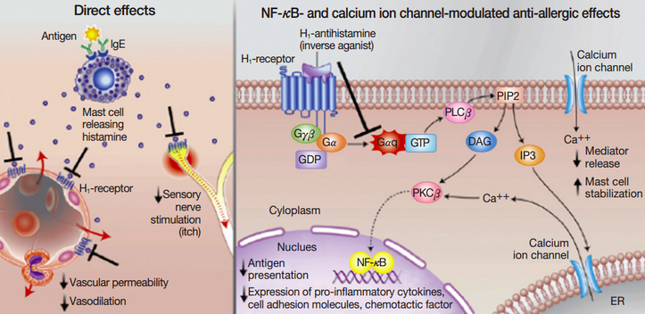 항히스타민제는 히스타민과 히스타민 수용체의 결합을 차단해요. 결합으로 인해 증상이 발현되는데 이것이 차단되면 가려움, 눈물, 콧물, 부종 등의 증상이 나타나지 않겠지요.