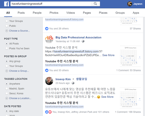 구글에 영어로 검색할 수 있다는 것은 한국에서 구할 수 없는 고급 정보를 갖고 있는 것과 같다. 2018년, 나는 취업을 준비하면서 티스토리 블로그에 IT 서비스에 대한 글을 쓰고 있었다. 당시 Youtube 추천 알고리즘을 분석하다가 구글 엔지니어들이 쓴 영어 논문이 있어서 공부도 할 겸, 블로그에 영어 논문을 한글로 요약한 글을 올렸다. 글을 쓴 며칠 뒤, 2~3을 웃돌던 블로그 일 방문자 수가 1500을 돌파했다. 이유를 파악해본 즉, 페이스북의 여러 개발자 커뮤니티에 내 글이 공유된 것이었다.