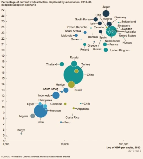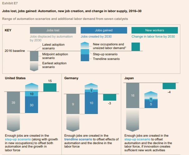 자동화 기술은 과거의 기술 진보가 그래왔던 것처럼, 새로운 직업들을 만들어낼 것이다. 현재의 기술로도 사람들이 수행하는 일의 50% 정도를 자동화 할 수 있지만, 2030년까지 실제로 대체되는 일의 비율은 기술의 수용에 영향을 주는 기술적, 경제적, 사회적 요인 때문에 높지 않을 것이다. 46개국을 조사 한 결과, 2030년까지 예상되는 자동화 대체 비율은 0% 부터 30% 사이로, 중간값은 15%로 파악된다. 자동화 대체 비율은 나라에 따라 편차가 크며, 선진국일수록 고임금에 의한 자동화 영향이 더욱 높은 것으로 보인다. (임금이 높아질 수록, 자동화 할 이유가 많아짐)