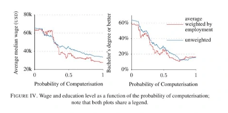 프레이와 오스본은 직업 소득과 교육 수준이 높을 수록 자동화 확률이 낮은 것을 발견했다. 이는 중간 임금 직업이 사라져 온 지난 추세와 달리 앞으로는 저임금, 단순 업무가 우선적으로 자동화 될 것임을 보여준다.