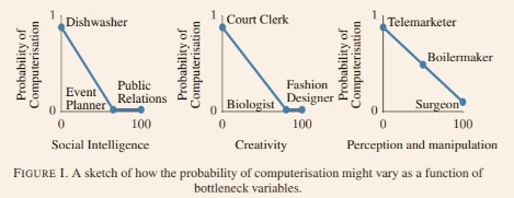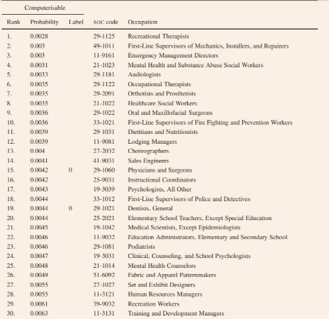 창의적 지능, 사회적 지능 등은 컴퓨터로 구현해내기에 어려움이 있으며, 따라서 위 역량을 필요로 하는 직업들 - 디자이너, 응용 과학.기술자, 기업 임원, 교사 등 - 은 자동화 확률이 30%로 가장 낮으며 자동화하기까지 시간이 가장 오래 걸린다. 2010년 기준, 미국 노동인구 중 33%가 자동화 확률이 낮은 직업군에 속해있다.