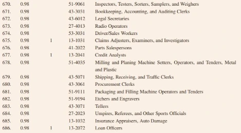텔레마케터, 법률 비서, 재봉사, 응용 수학자, 보험 손해사정사 및 관련직, 시계 수리공, 운송업 종사자, 세무대리인, 사진처리사, 은행 창구 직원 및 관련 업무 (계좌개설 및 대출 상담 등), 도서관 사서, 데이터 입력과 관련된 직업들, 운동경기 심판, 강판 조각사 (도장 파기와 같이 쇠, 나무에 패턴을 새기는 사람), 포장 기계 작동 감독, 조달 및 구매 관련 사무직, 재고 관리 및 포장 관련직, 철. 플라스틱 절단 기계 작동 감독, 신용등급 조사원, 운전기사와 단순 판매직, 회계장부 사무 업무, 샘플 검사자