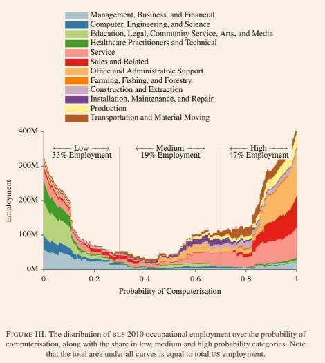 프레이와 오스본은 미국 전체 근로자 중 47%가 종사하는 직업은 10-20년 내에 자동화 될 확률이 70% 이상으로 높고, 위 그래프의 오른쪽부터 왼쪽으로, 자동화 확률이 높은 직업군부터 시간에 따라 순차적으로 자동화될 것이라고 말한다.