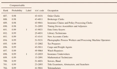 반대로 위 역량이 요구되지 않는 직업들 - 단순 판매 서비스직, 생산직, 사무보조직, 운전기사, 법률 비서 등 - 은 자동화 확률이 가장 높으며, 10-20년 내로 자동화 될 것이다. 2010년 기준, 미국 노동인구 중 47%가 자동화 확률이 70% 이상으로 높은 직업군에 속해있다.