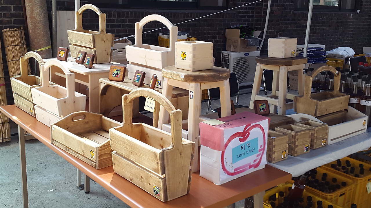 대부분이 목공 작업과는 거리가 먼 초보들이라 쉽지는 않았지만 힘을 합쳐 만든 소품이 50여 개는 되었다. 소품들의 색상은 흰색을 약하게 입히고 투명 오일스테인으로 마감 처리를 한 것과, 약한 앤틱 색상을 입히고 투명 오일스테인으로 마감 처리를 한 것 두 가지로 만들었다.