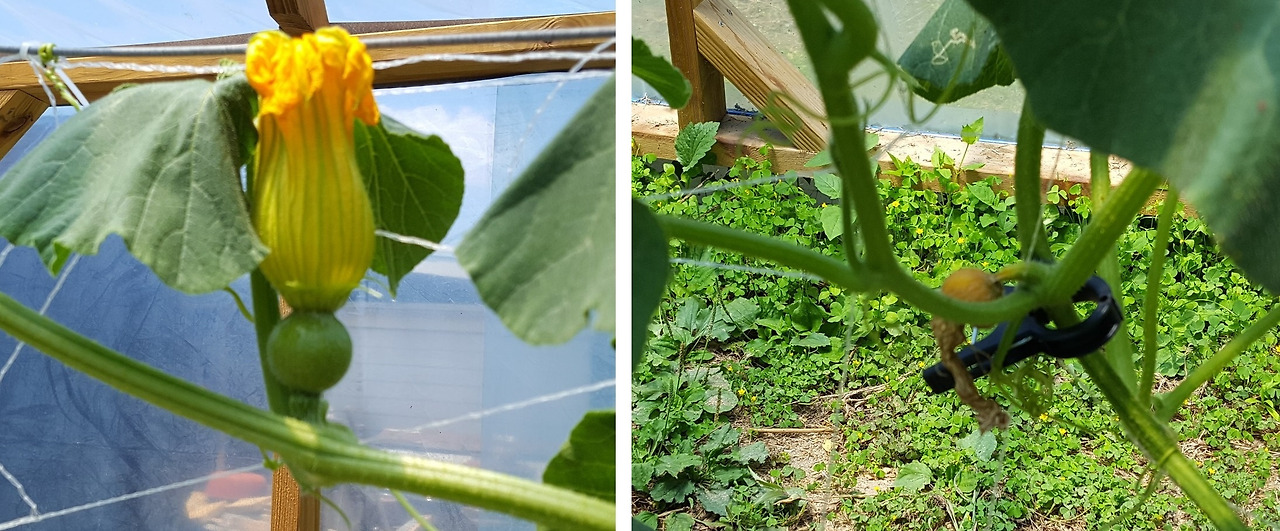 작은 호박이 매달린 게 호박 암꽃이고 (좌) 없는 게 수꽃이다. 수정이 안되면 이렇게 시들어 버린다 (우).