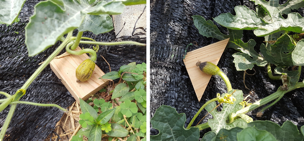 그런데 며칠 후, 수박 2개가 별 이유도 없이 갑자기 시들어버렸다. 어, 수박이 왜 이래? 가슴이 덜컹 내려앉았다. 딱 6개밖에 없었는데 하루아침에 2개가 시들어 버리다니... 갑자기 왜 수박이 시든 거지? 벌레가 파먹은 흔적도 없는데... 정확한 이유를 모르니 더 답답할 수밖에. 혹시 땅에서 습기가 올라와서인가? 그래서 나뭇조각을 가져다가 남아있는 작은 수박 아래에 받쳐주었다.