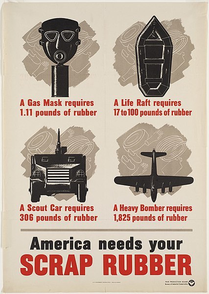 2차 세계대전발발과 함께 일본은 말레이 반도등 천연고무의 주요 생산지를 장악하고 천연고무의 공급망을 끊어버렸습니다. 최근 미국이 반도체, 반도체 기술, 소재, 장비등 중국향 반도체 공급망을 끊는 것과 유사할 정도로 미국의 산업계 특히 전쟁물자생산에는 치명적인 사태였습니다. 독일은 앞선 1차 세계대전중 연합군이 우월한 해군으로 각종 자원공급을 막았던 상황에서 여러 종류의 합성고무를 직접 개발해서 사용중이었지만 미국은 일본이 조선에서 전쟁물자 생산을 위해 놋그릇까지 싹쓸이해 갔던 것 처럼 강제는 아니였지만 가정에서 쓰던 각종 고무까지 모아야만 했습니다.