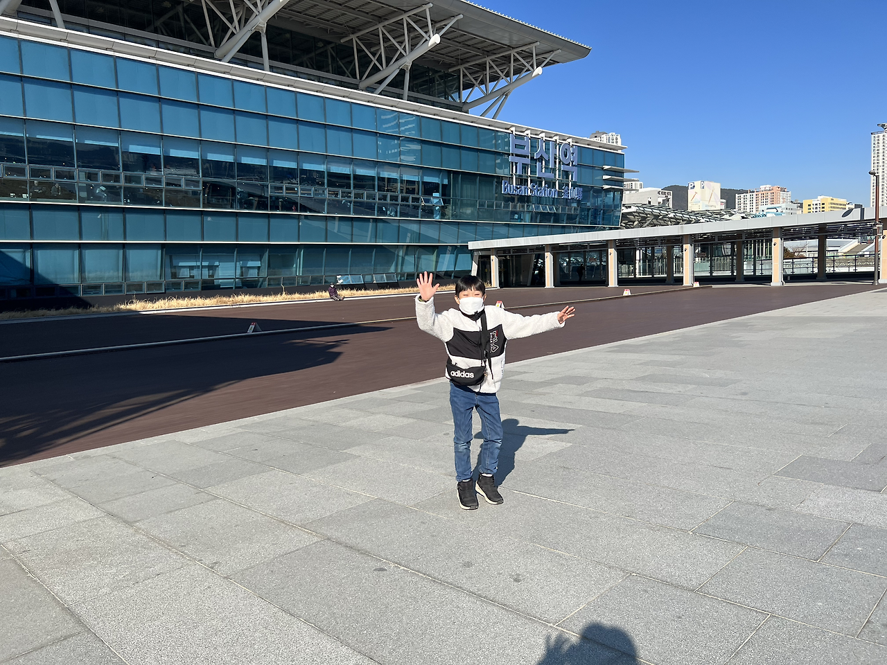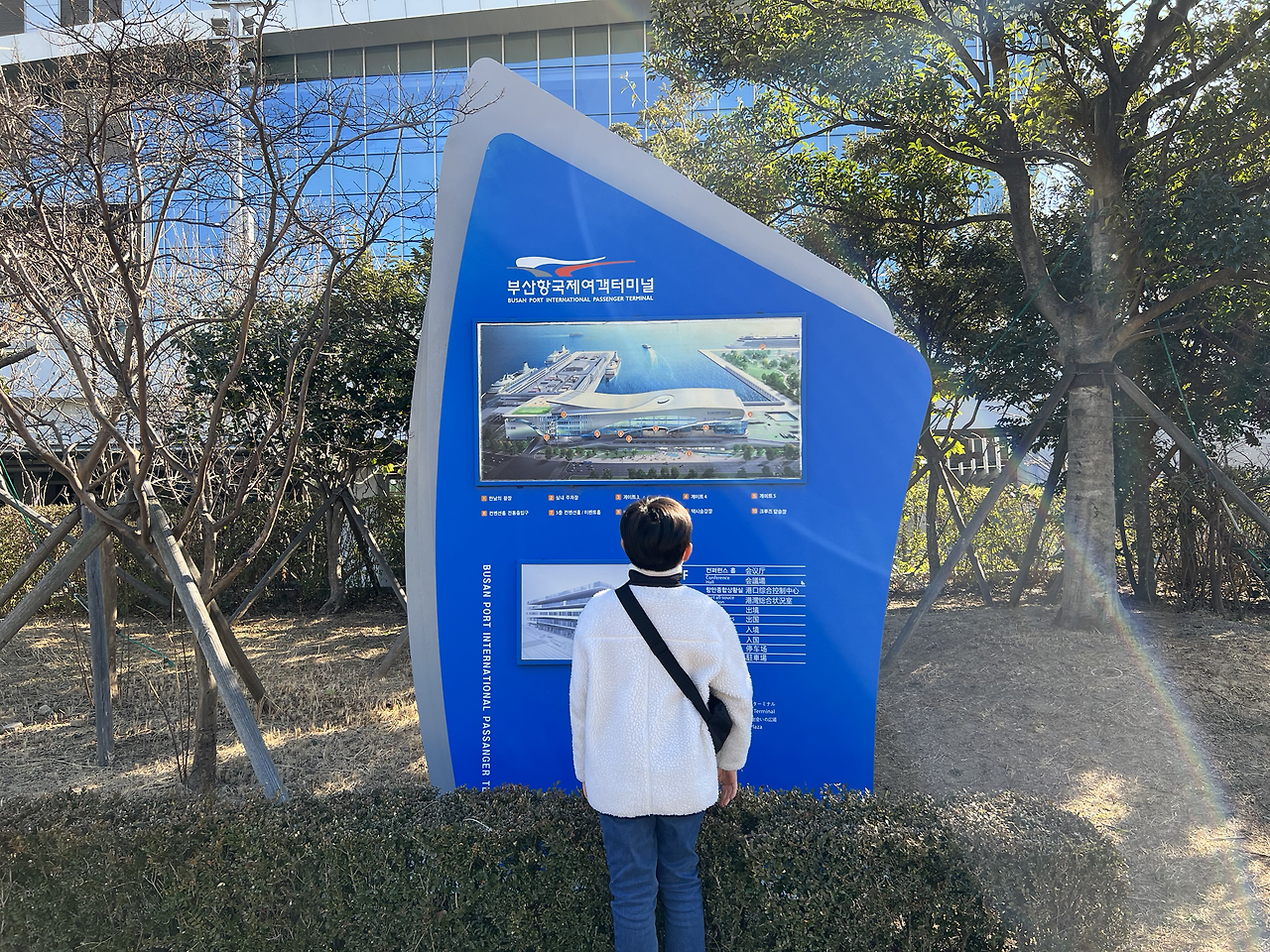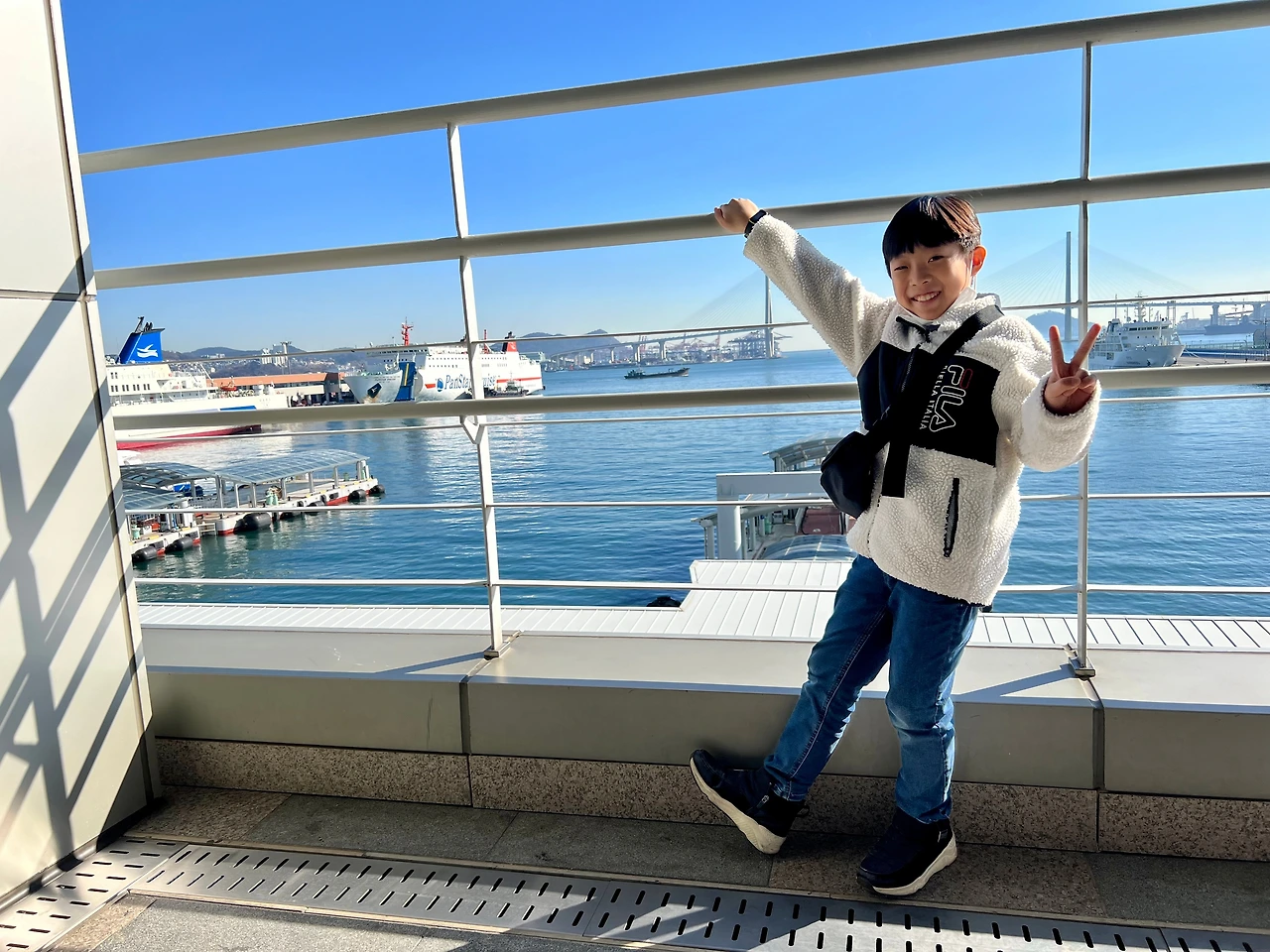 아들과 함께 남친샷 촬영. 하기 싫어하는 기색이 완연하네요. 저멀리 부산항국제여객터미널이 보입니다. 출발!!~~~