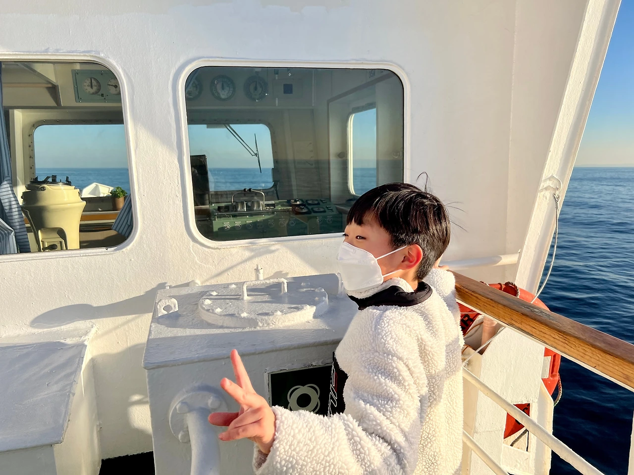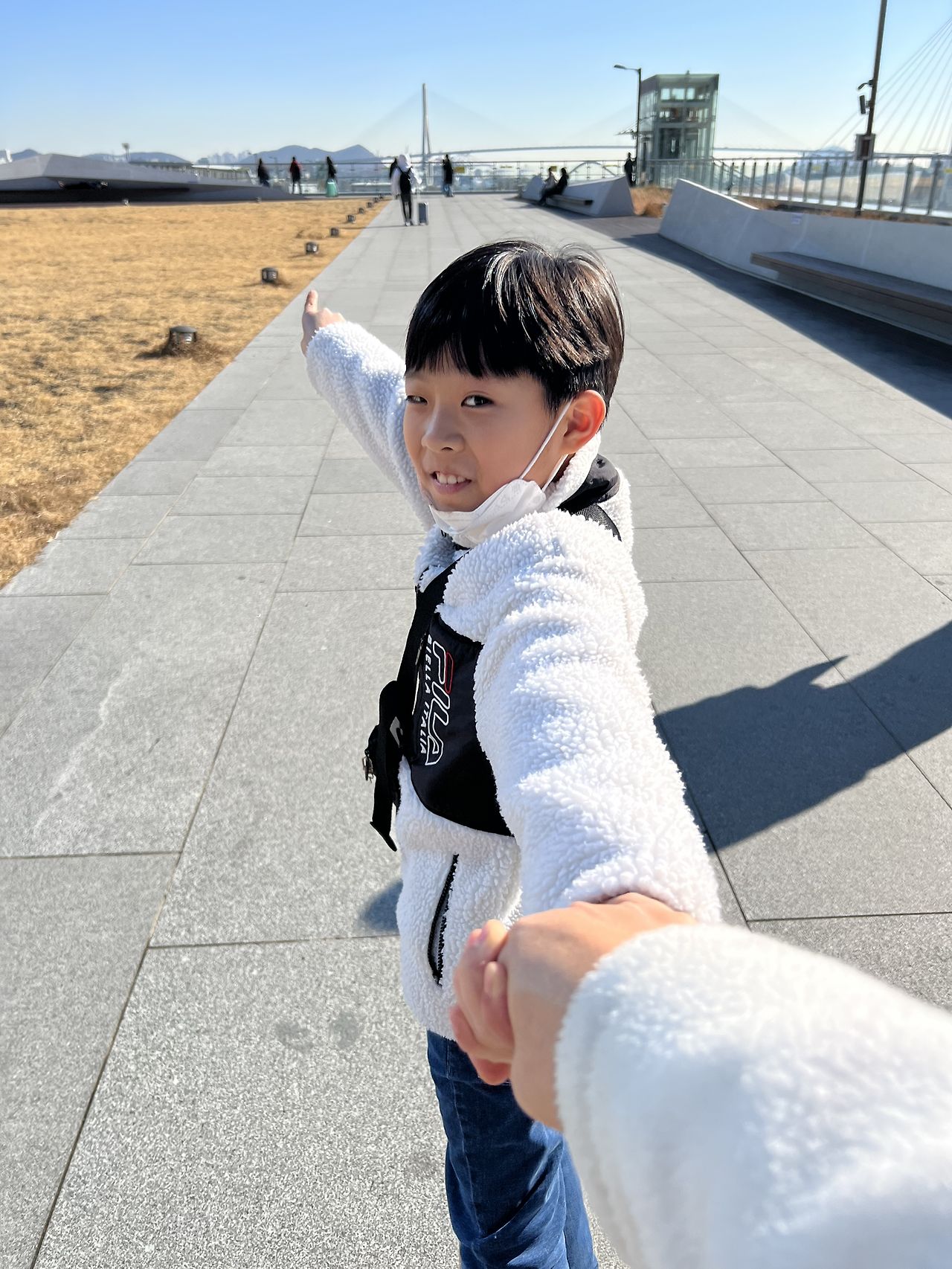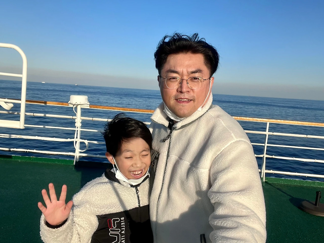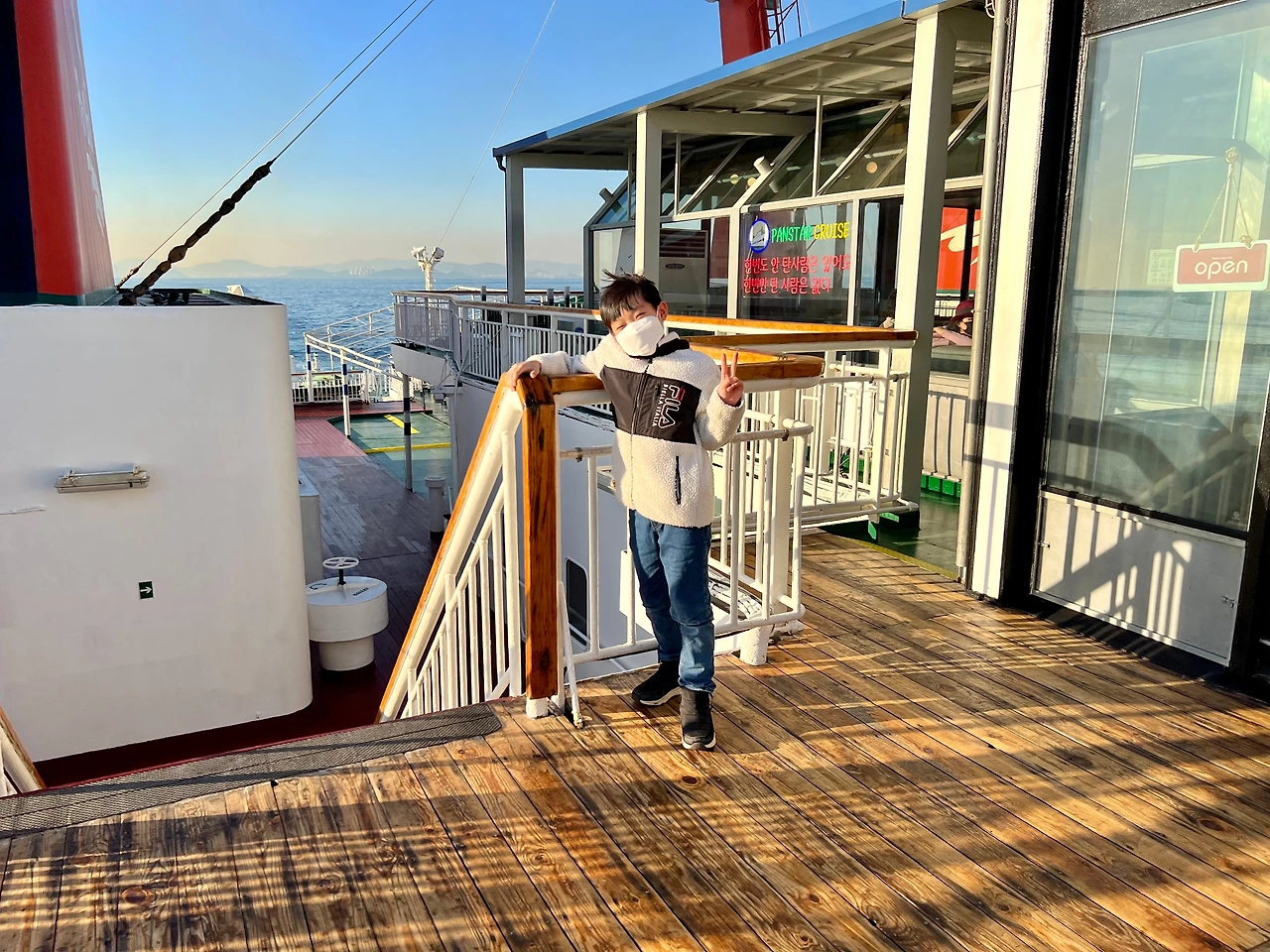 아들과 함께 남친샷 촬영. 하기 싫어하는 기색이 완연하네요. 저멀리 부산항국제여객터미널이 보입니다. 출발!!~~~