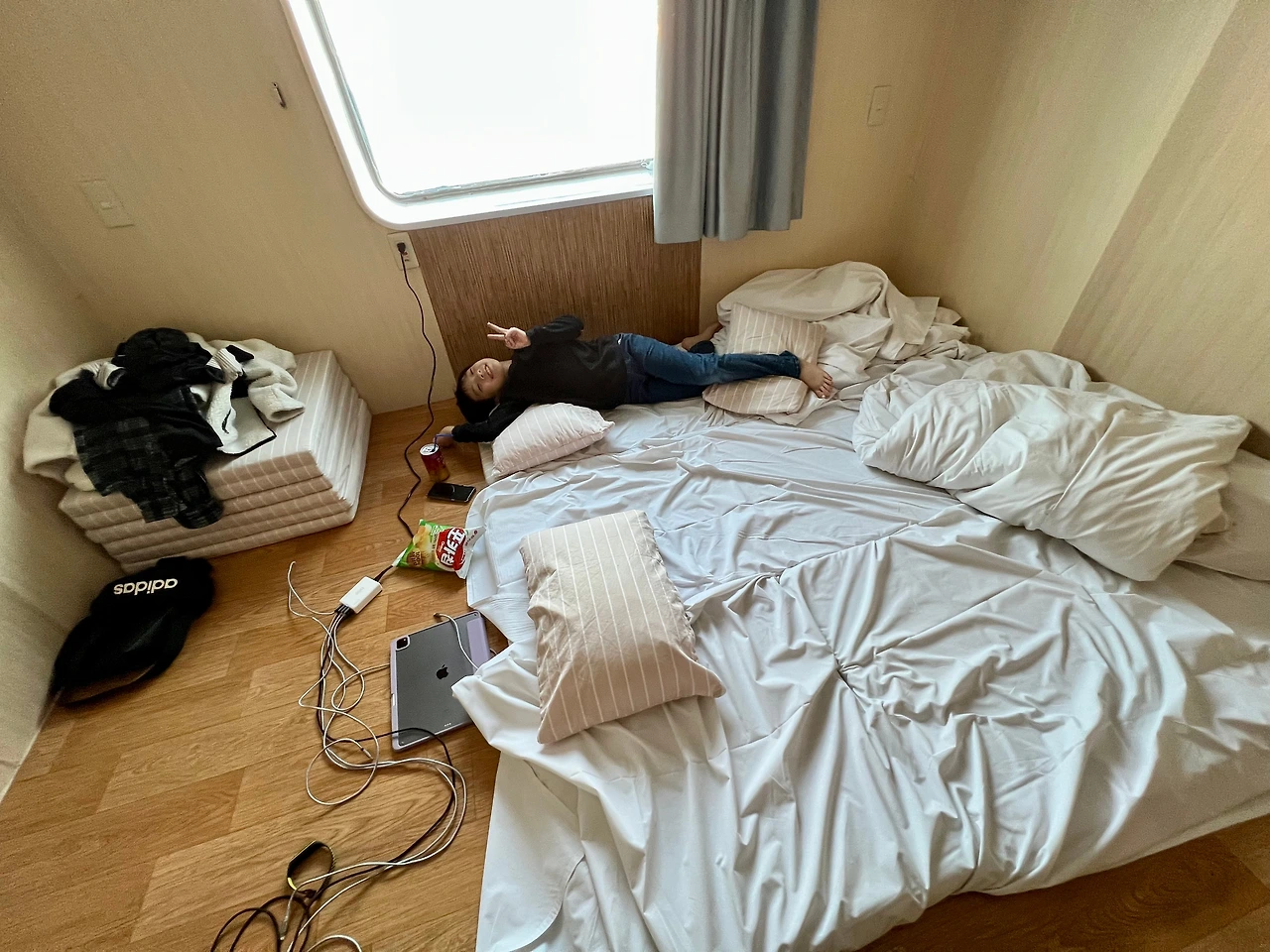 5명까지 잘 수 있는 방에 아들과 둘이 있습니다. 뒹굴뒹굴하면서 같이 애니메이션도 보고, 게임도 하고, 바다도 구경하고 좋네요. ^^v