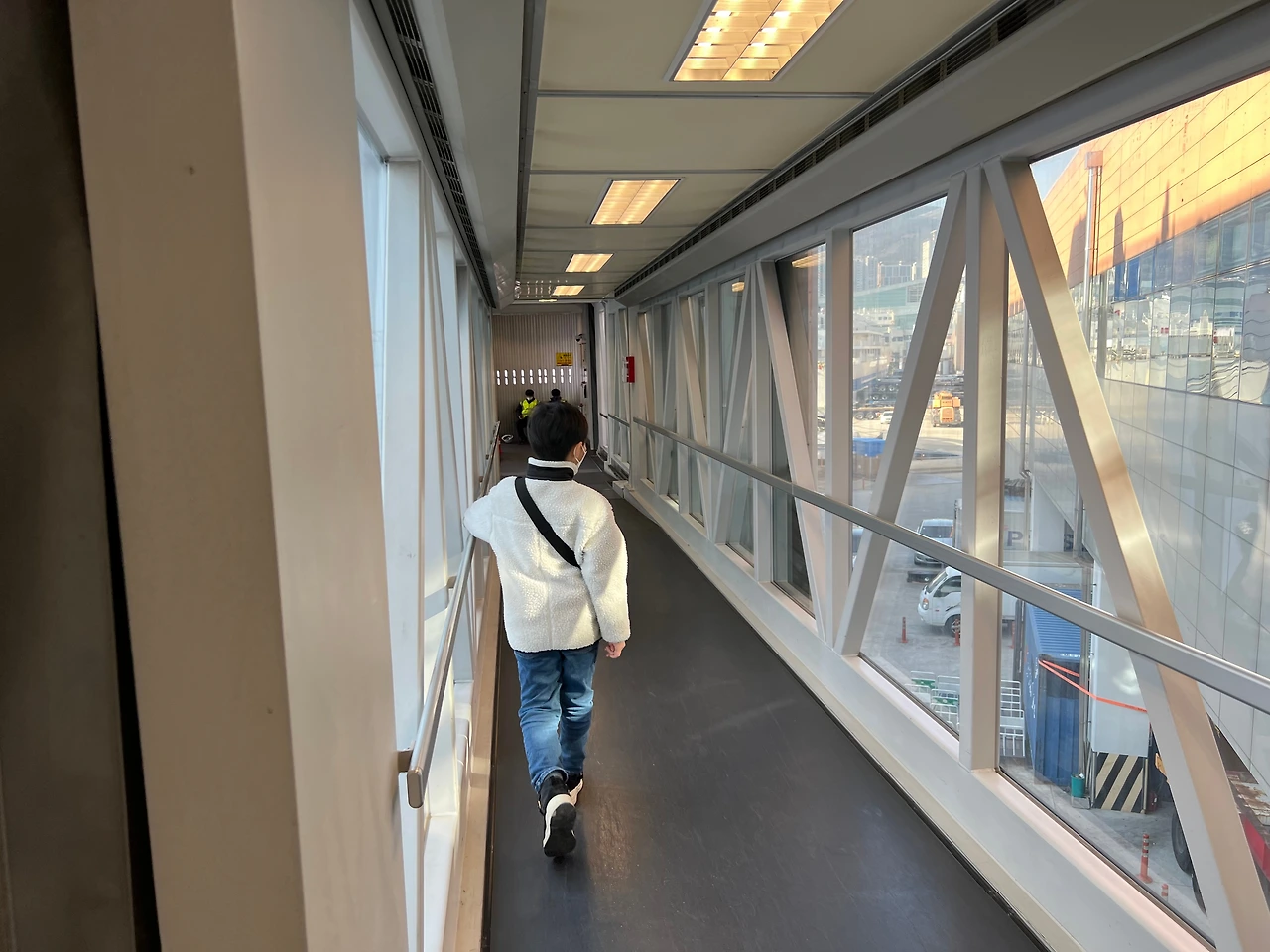 부산항 국제여객터미널로 이어지는 육교 좋습니다. 야호! 옆에 지나가는 외국인 중년여자분 가방이 열려있길래 열렸다고 알려주면서 어디서 왔냐고 물어보니 프랑스에서왔다고 하더라구요. 부부와 딸2명 모두 4명이 한국여행을 하고 일본 후쿠오카로 넘어가는 중이라고 했습니다. 우리 가족도 저렇게 세계여행을 해야겠습니다.